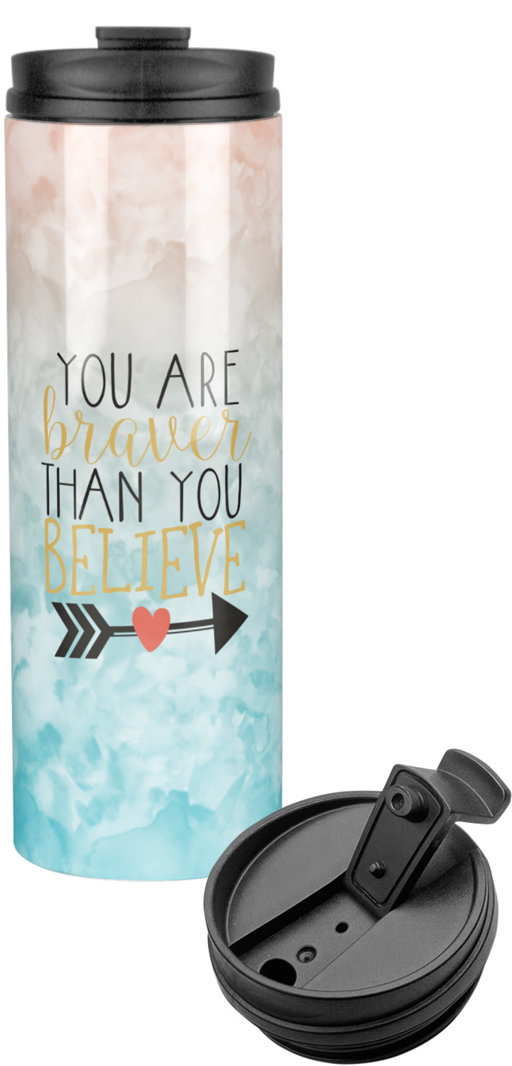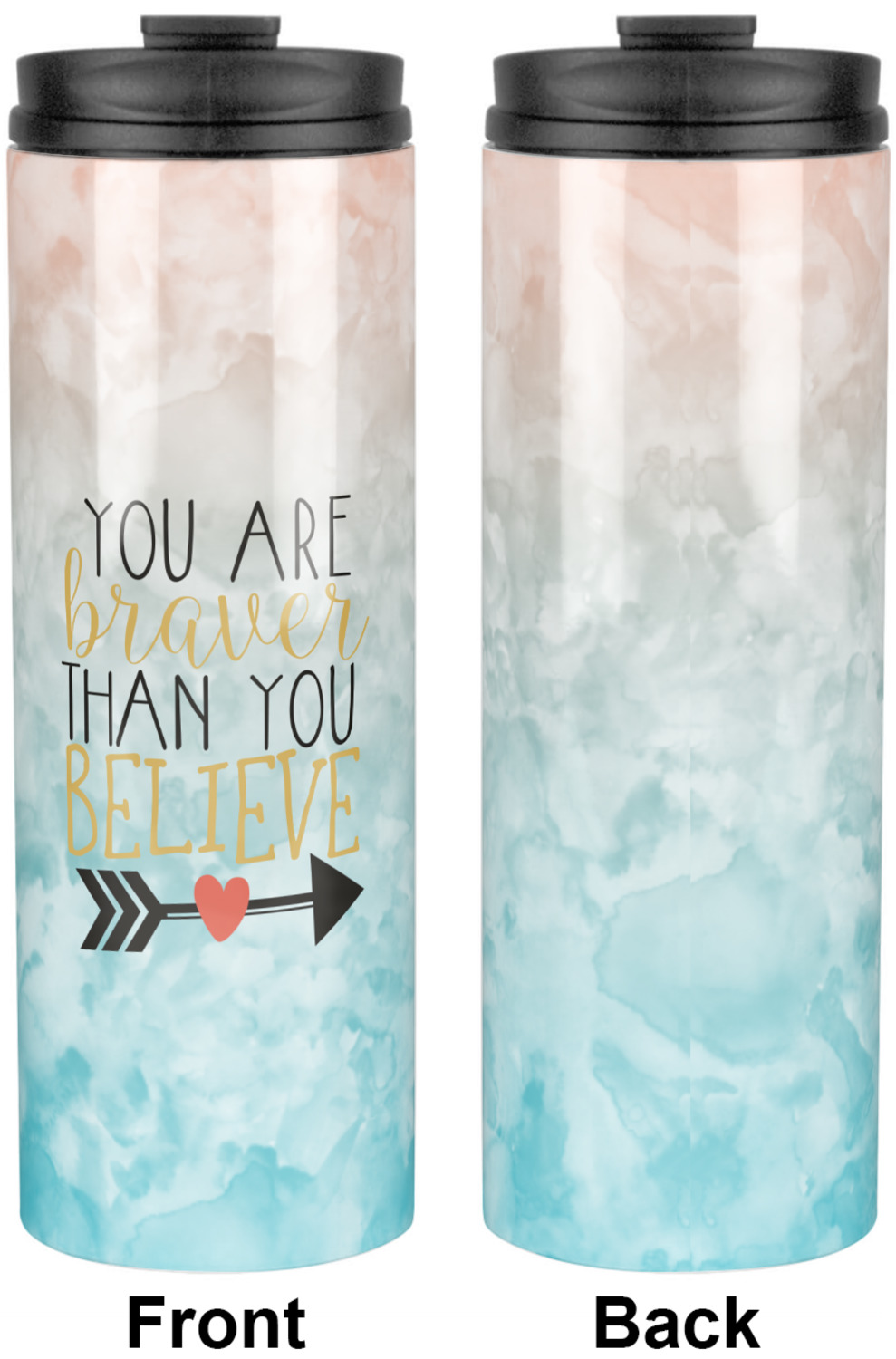 This design features one of our many inspirational quotes. This quote in particular reminds you that "you are braver than you believe." This uplifting quote has beatuiful and playful fonts to create it. An arrow sits below the quote to symbolize the bravery of the heart. The background is a lovely hombre watercolor pattern of teal/turquoise and peach. The calming colors make for a lovely inspirational design.