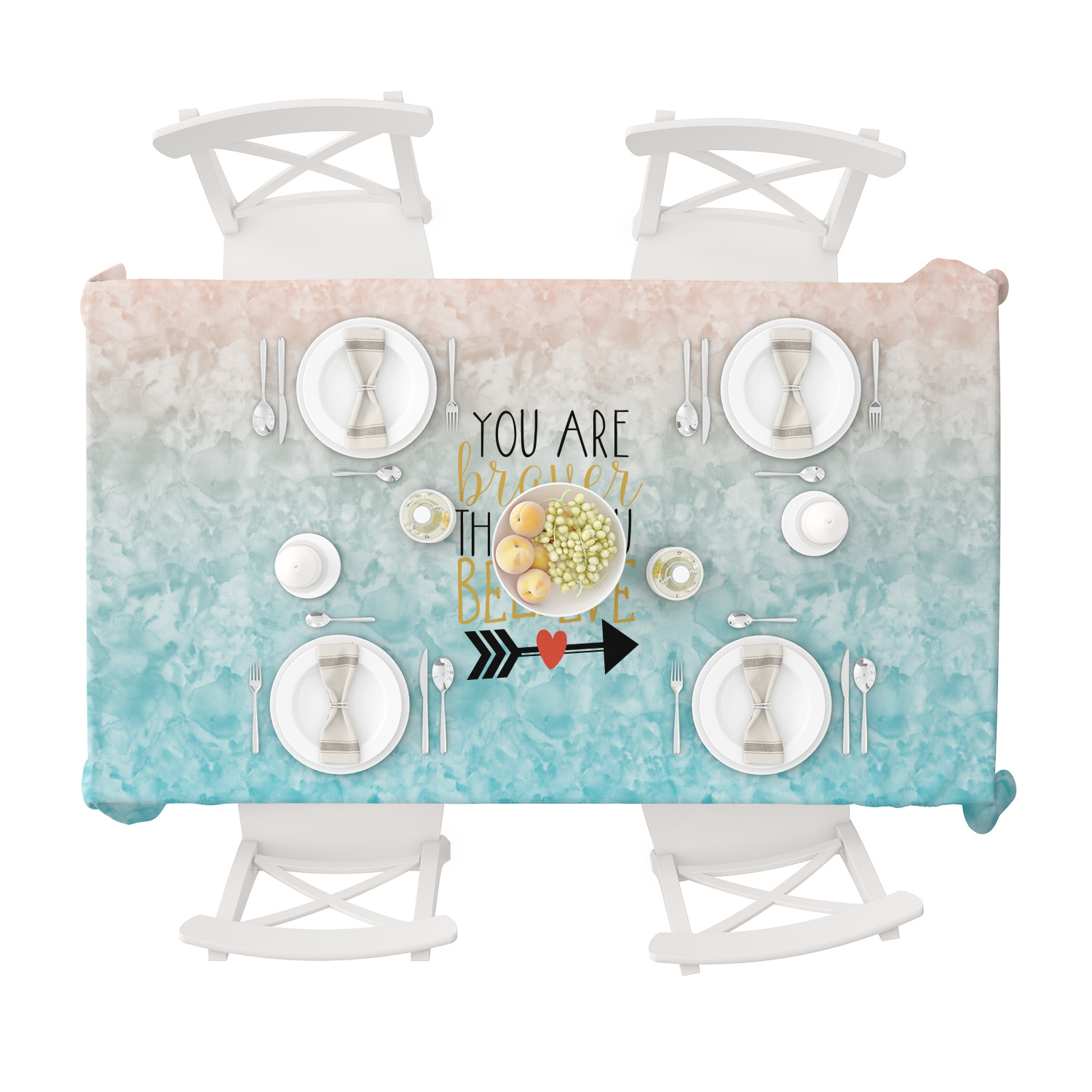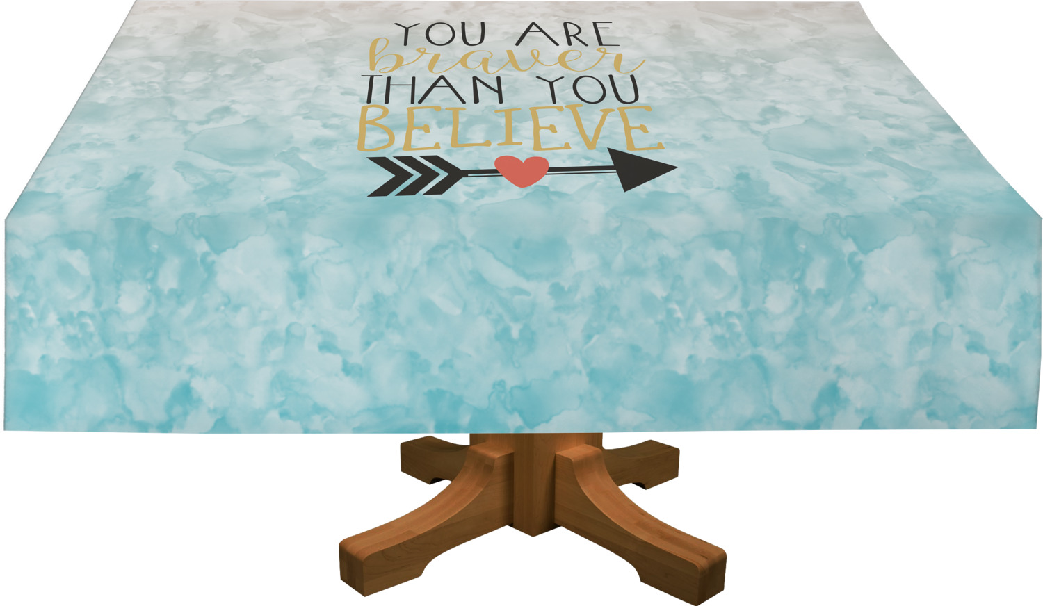 This design features one of our many inspirational quotes. This quote in particular reminds you that "you are braver than you believe." This uplifting quote has beatuiful and playful fonts to create it. An arrow sits below the quote to symbolize the bravery of the heart. The background is a lovely hombre watercolor pattern of teal/turquoise and peach. The calming colors make for a lovely inspirational design.