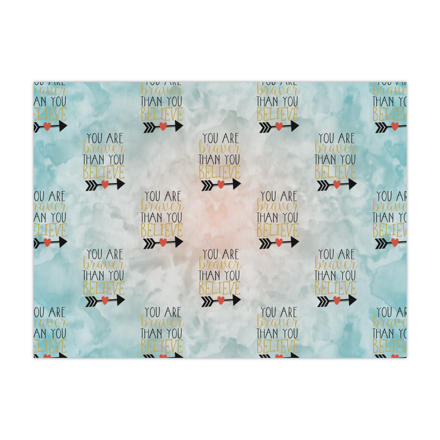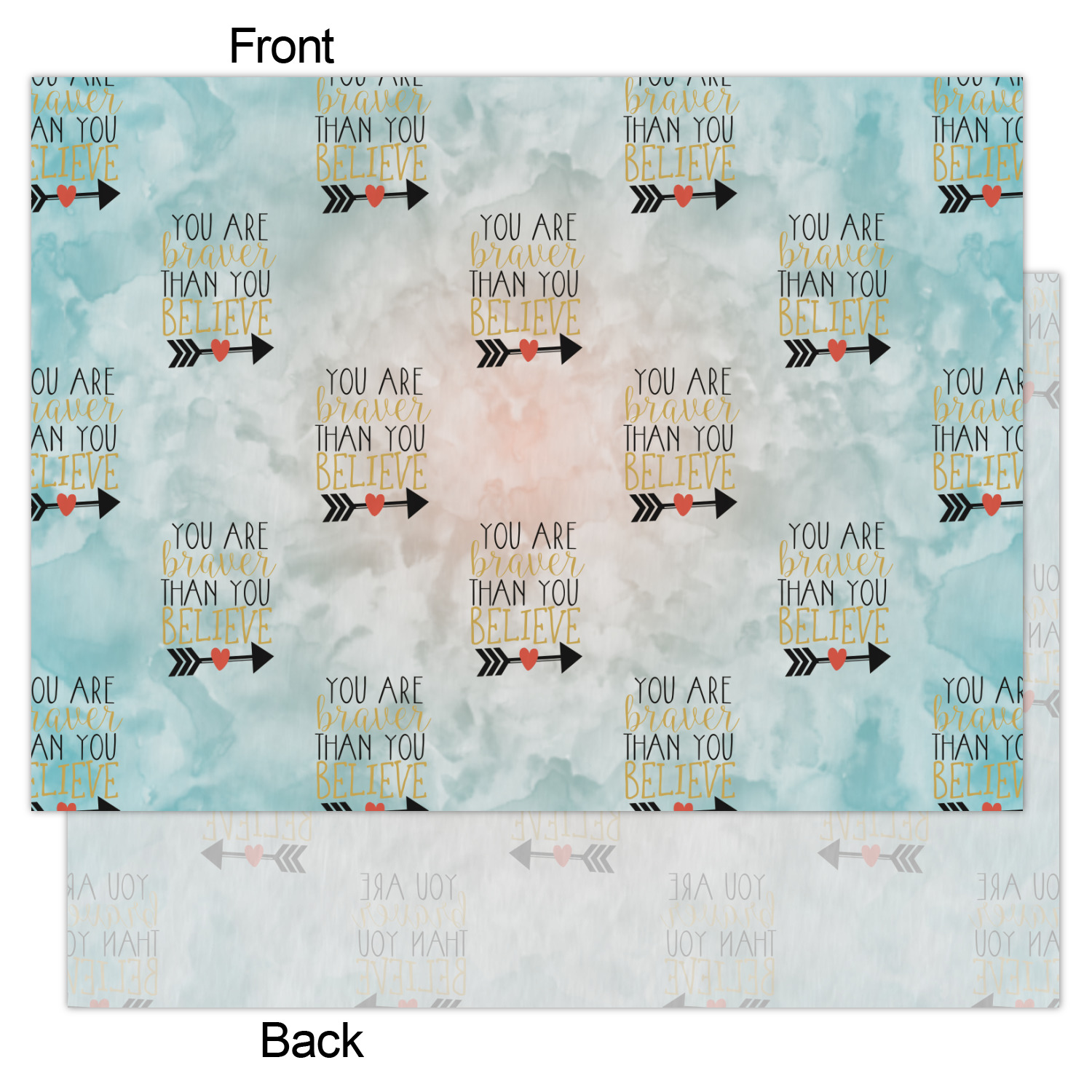 This design features one of our many inspirational quotes. This quote in particular reminds you that "you are braver than you believe." This uplifting quote has beatuiful and playful fonts to create it. An arrow sits below the quote to symbolize the bravery of the heart. The background is a lovely hombre watercolor pattern of teal/turquoise and peach. The calming colors make for a lovely inspirational design.
