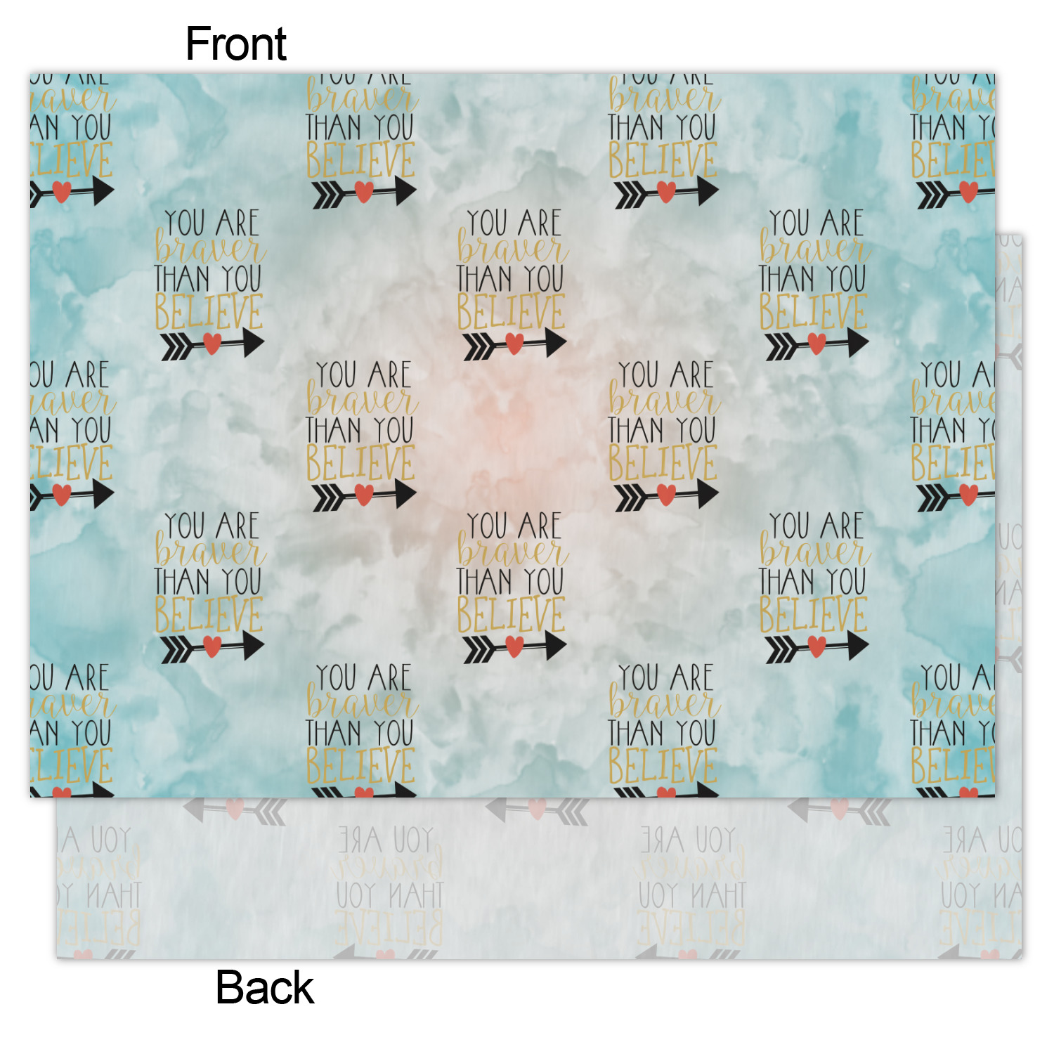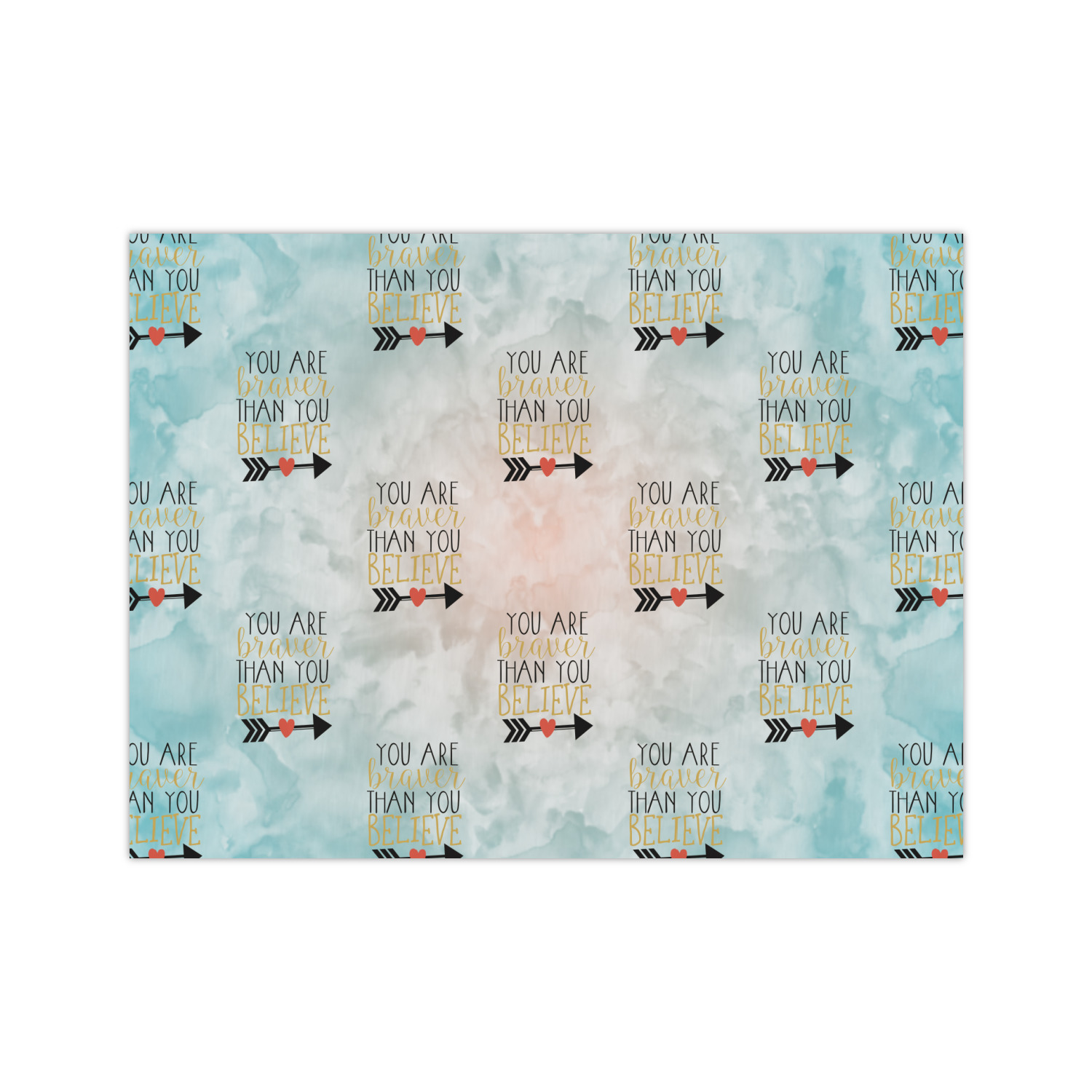 This design features one of our many inspirational quotes. This quote in particular reminds you that "you are braver than you believe." This uplifting quote has beatuiful and playful fonts to create it. An arrow sits below the quote to symbolize the bravery of the heart. The background is a lovely hombre watercolor pattern of teal/turquoise and peach. The calming colors make for a lovely inspirational design.