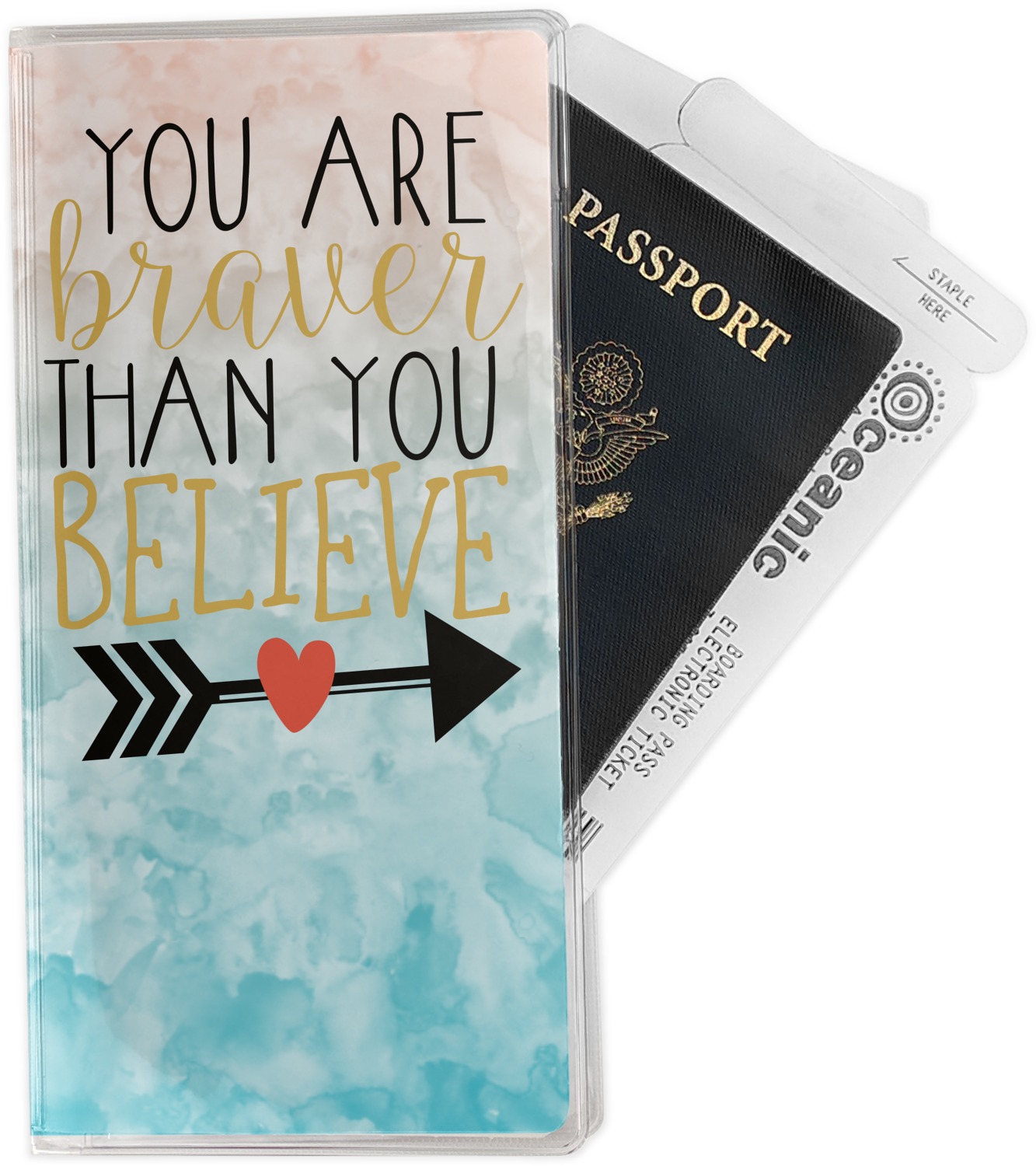 This design features one of our many inspirational quotes. This quote in particular reminds you that "you are braver than you believe." This uplifting quote has beatuiful and playful fonts to create it. An arrow sits below the quote to symbolize the bravery of the heart. The background is a lovely hombre watercolor pattern of teal/turquoise and peach. The calming colors make for a lovely inspirational design.