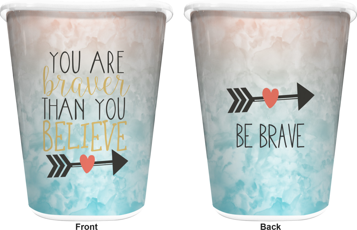 You can choose to purchase these decorative wastebaskets in either a white or a black color that will show on the base and the upper rim. Your customization is printed on a high-gloss, fine-quality vinyl adhesive, and you can choose to either have this adhesive applied to one side only or to both sides. As such, this plastic wastebasket can be single-sided or double-sided, depending on your creative vision. Your customization is printed using durable inks, making the design waterproof and resistant to fading over time.