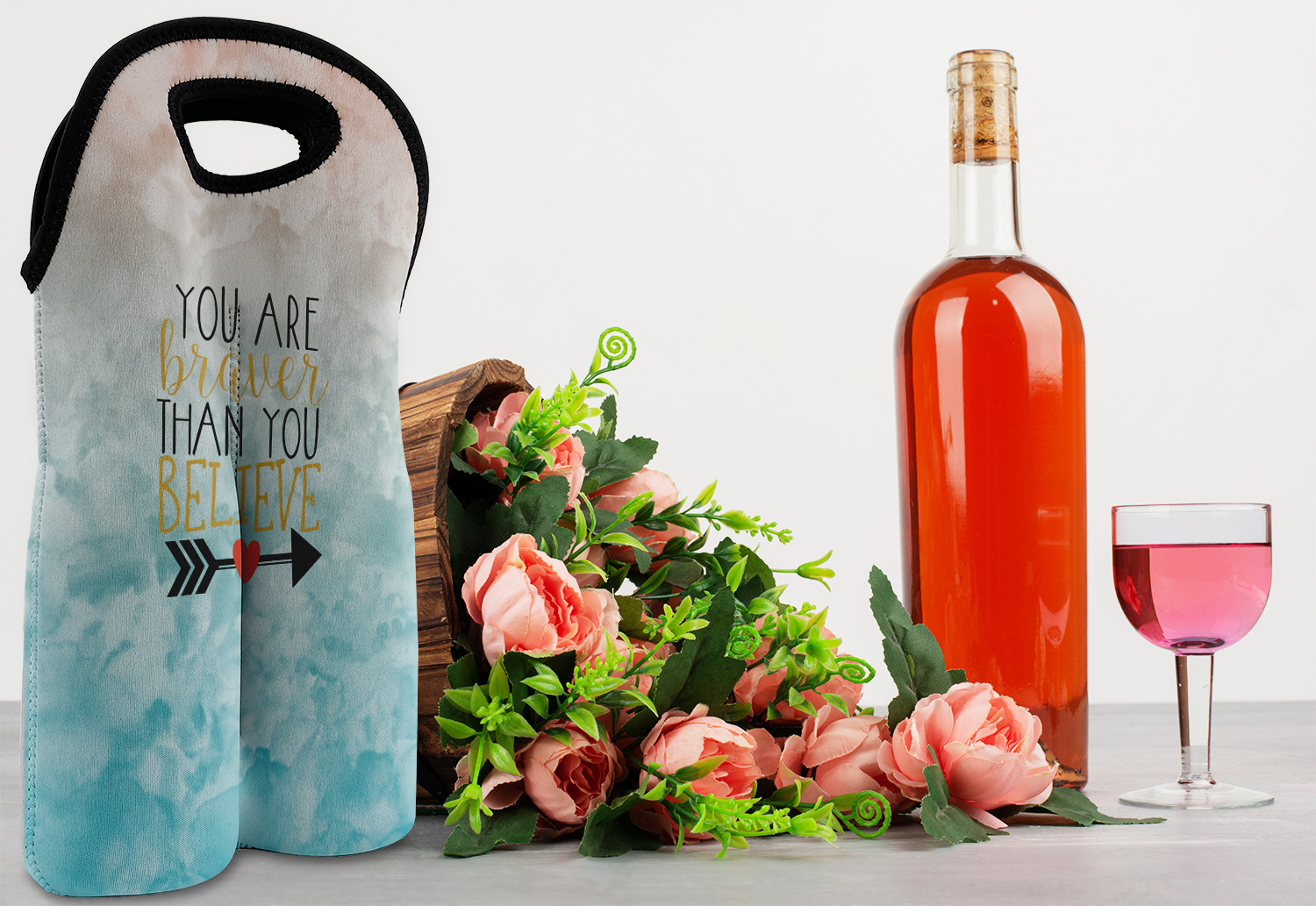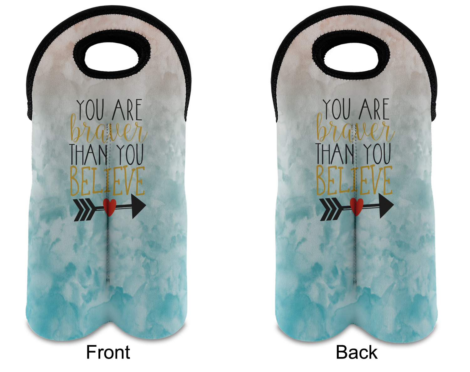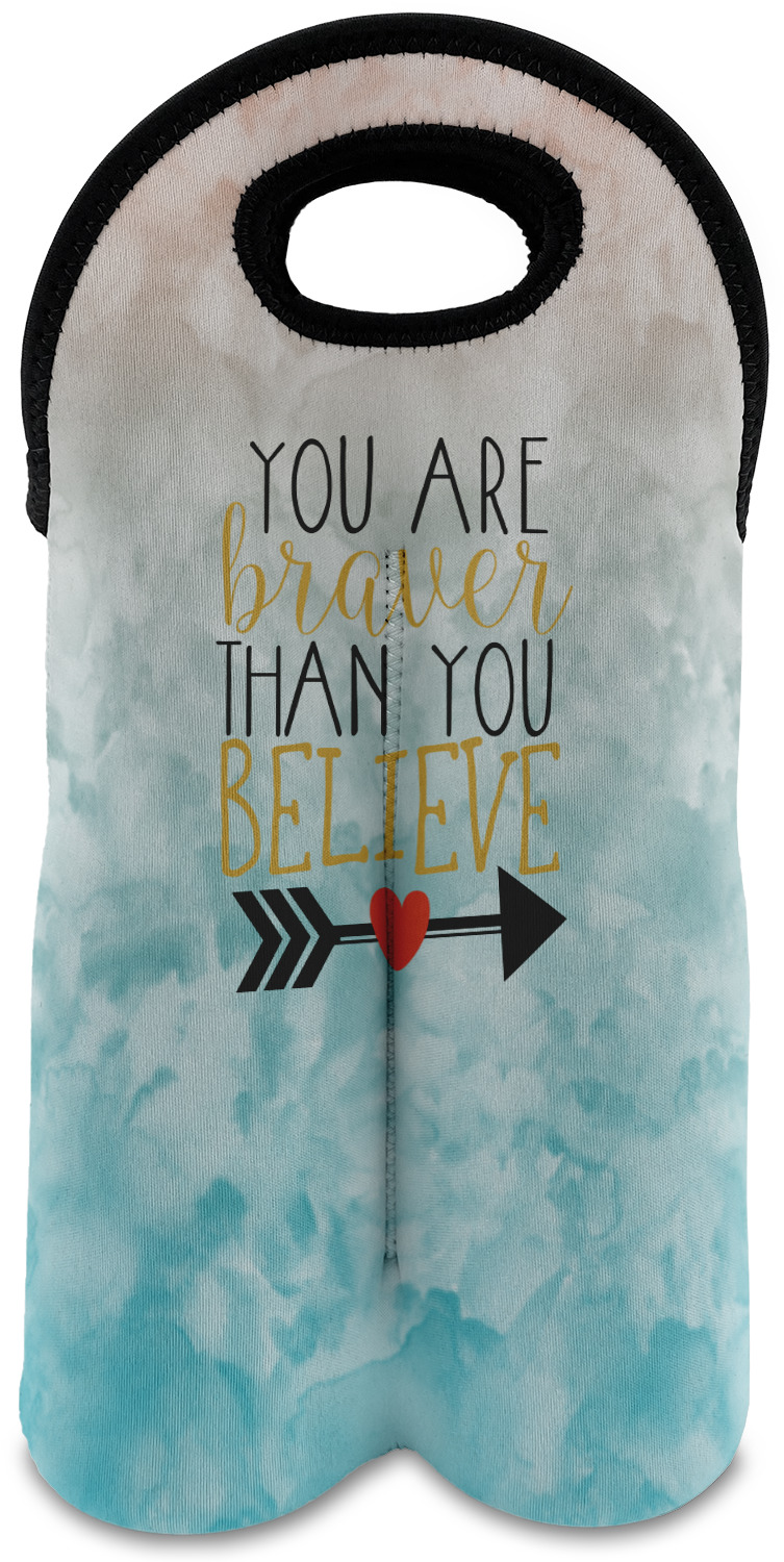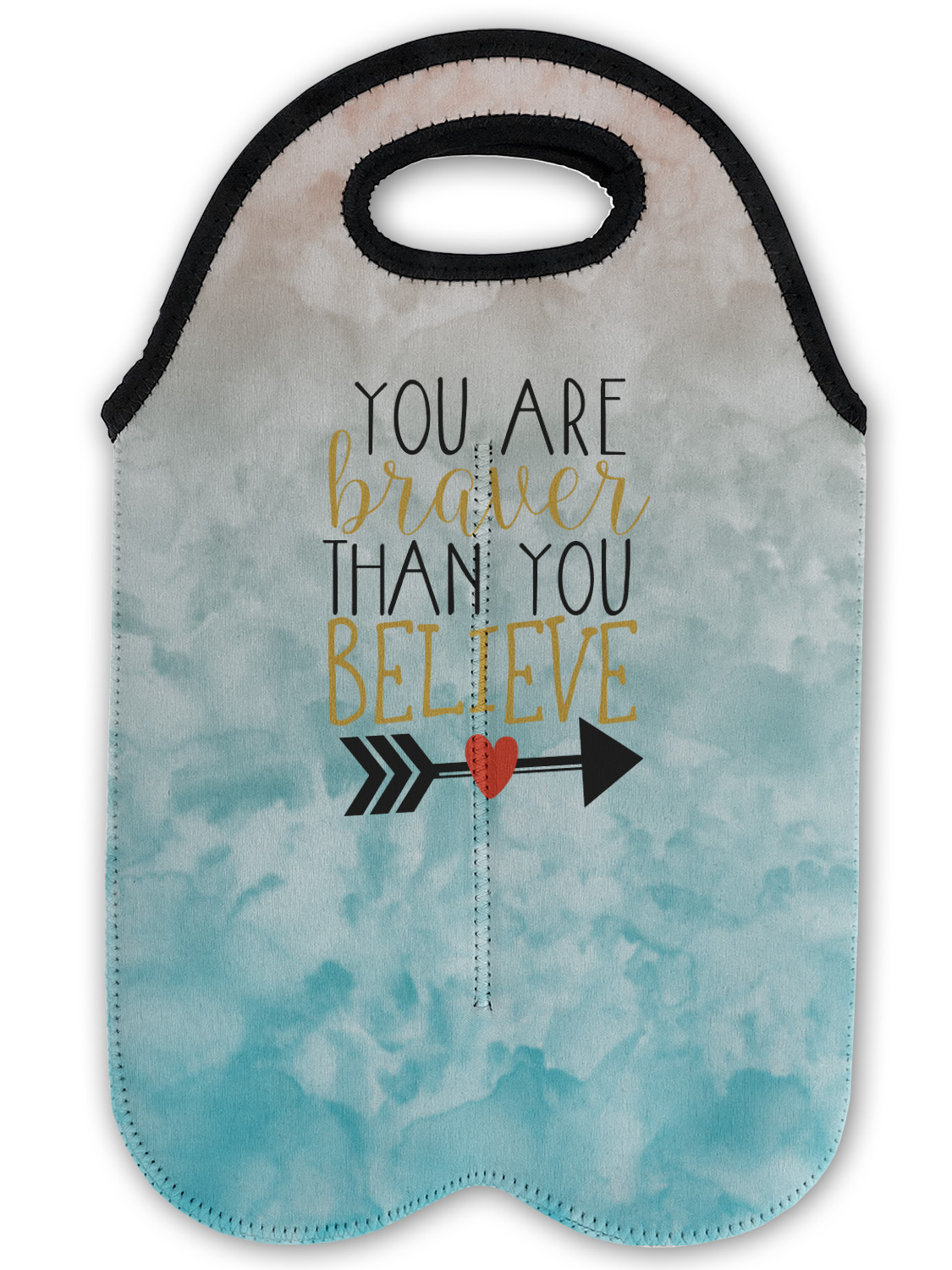 This design features one of our many inspirational quotes. This quote in particular reminds you that "you are braver than you believe." This uplifting quote has beatuiful and playful fonts to create it. An arrow sits below the quote to symbolize the bravery of the heart. The background is a lovely hombre watercolor pattern of teal/turquoise and peach. The calming colors make for a lovely inspirational design.