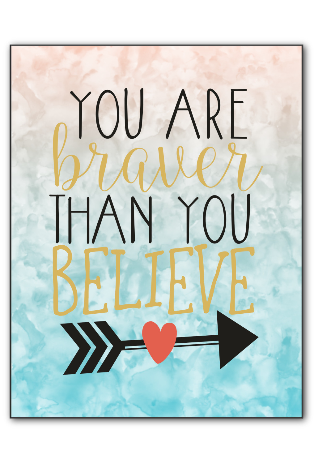 This design features one of our many inspirational quotes. This quote in particular reminds you that "you are braver than you believe." This uplifting quote has beatuiful and playful fonts to create it. An arrow sits below the quote to symbolize the bravery of the heart. The background is a lovely hombre watercolor pattern of teal/turquoise and peach. The calming colors make for a lovely inspirational design.