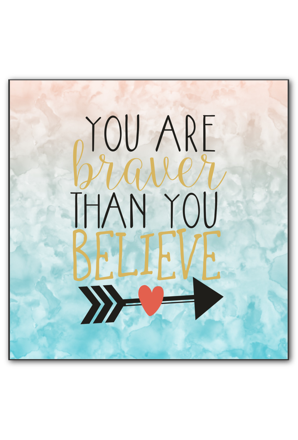 This design features one of our many inspirational quotes. This quote in particular reminds you that "you are braver than you believe." This uplifting quote has beatuiful and playful fonts to create it. An arrow sits below the quote to symbolize the bravery of the heart. The background is a lovely hombre watercolor pattern of teal/turquoise and peach. The calming colors make for a lovely inspirational design.
