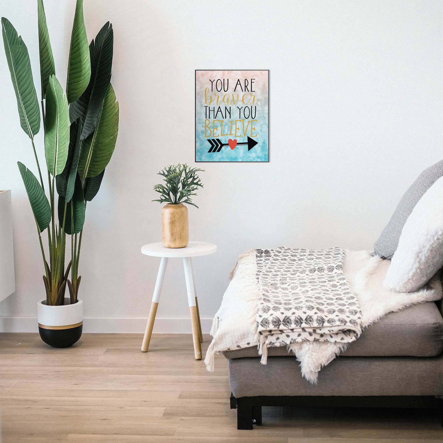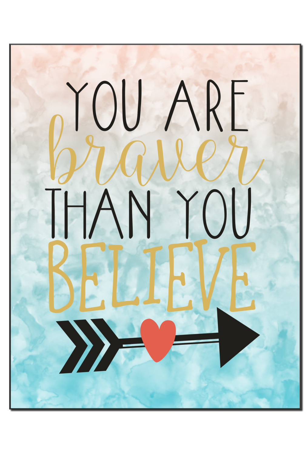 This design features one of our many inspirational quotes. This quote in particular reminds you that "you are braver than you believe." This uplifting quote has beatuiful and playful fonts to create it. An arrow sits below the quote to symbolize the bravery of the heart. The background is a lovely hombre watercolor pattern of teal/turquoise and peach. The calming colors make for a lovely inspirational design.