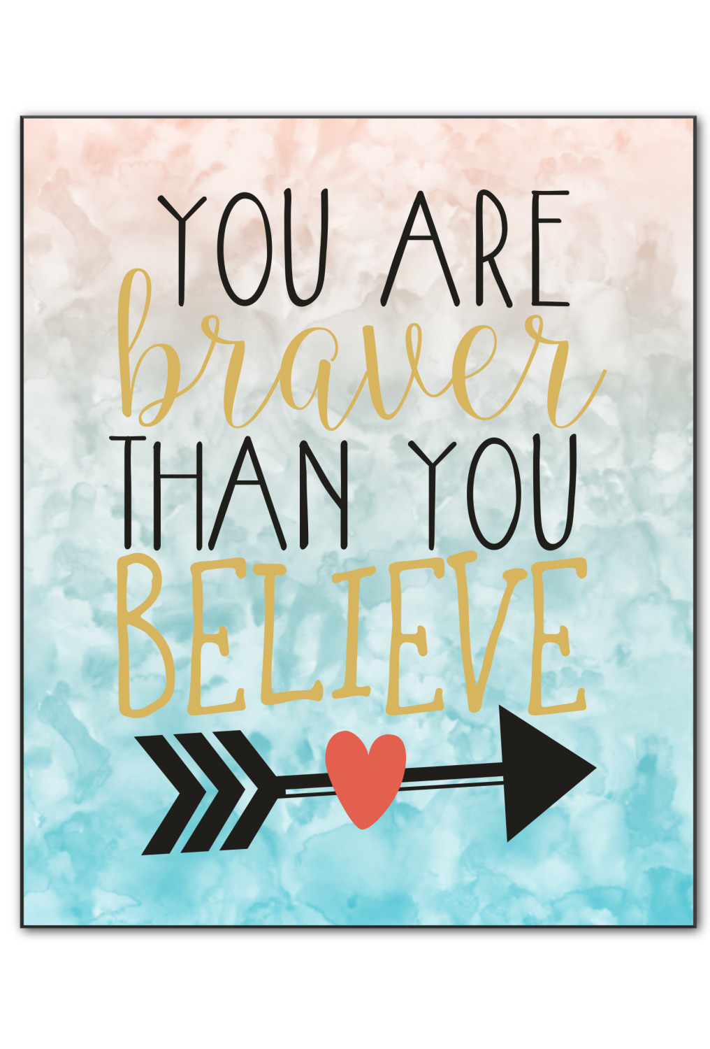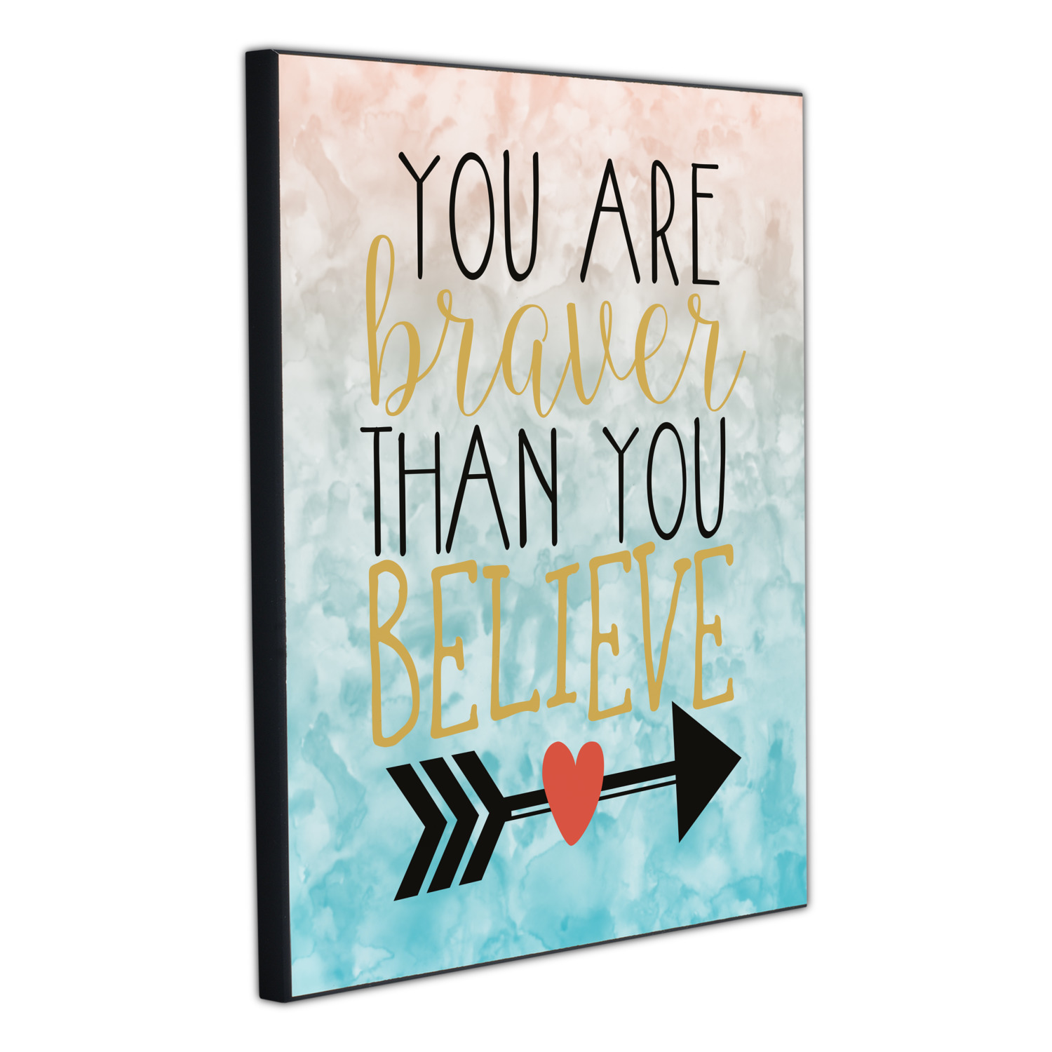 This design features one of our many inspirational quotes. This quote in particular reminds you that "you are braver than you believe." This uplifting quote has beatuiful and playful fonts to create it. An arrow sits below the quote to symbolize the bravery of the heart. The background is a lovely hombre watercolor pattern of teal/turquoise and peach. The calming colors make for a lovely inspirational design.
