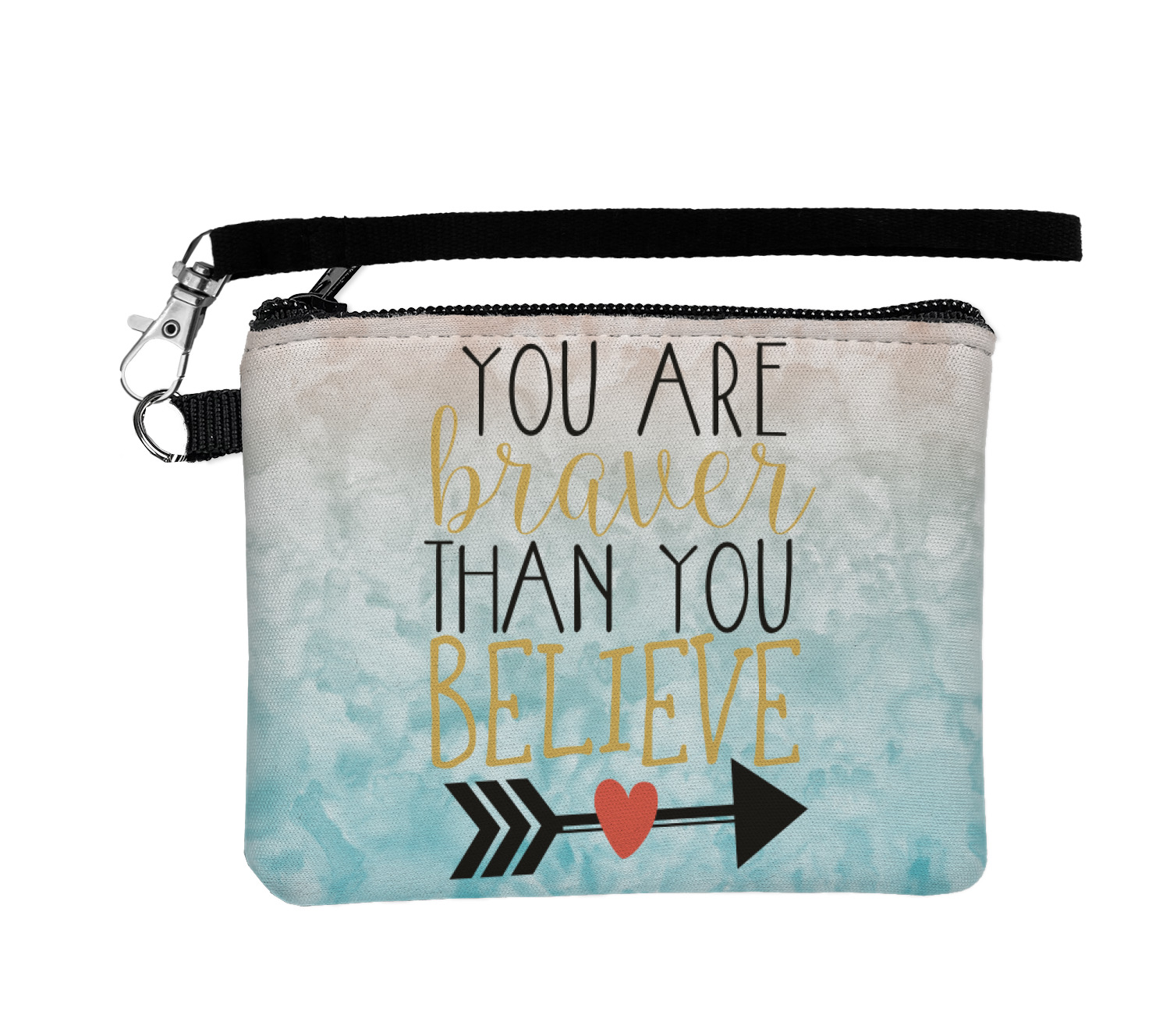 This design features one of our many inspirational quotes. This quote in particular reminds you that "you are braver than you believe." This uplifting quote has beatuiful and playful fonts to create it. An arrow sits below the quote to symbolize the bravery of the heart. The background is a lovely hombre watercolor pattern of teal/turquoise and peach. The calming colors make for a lovely inspirational design.