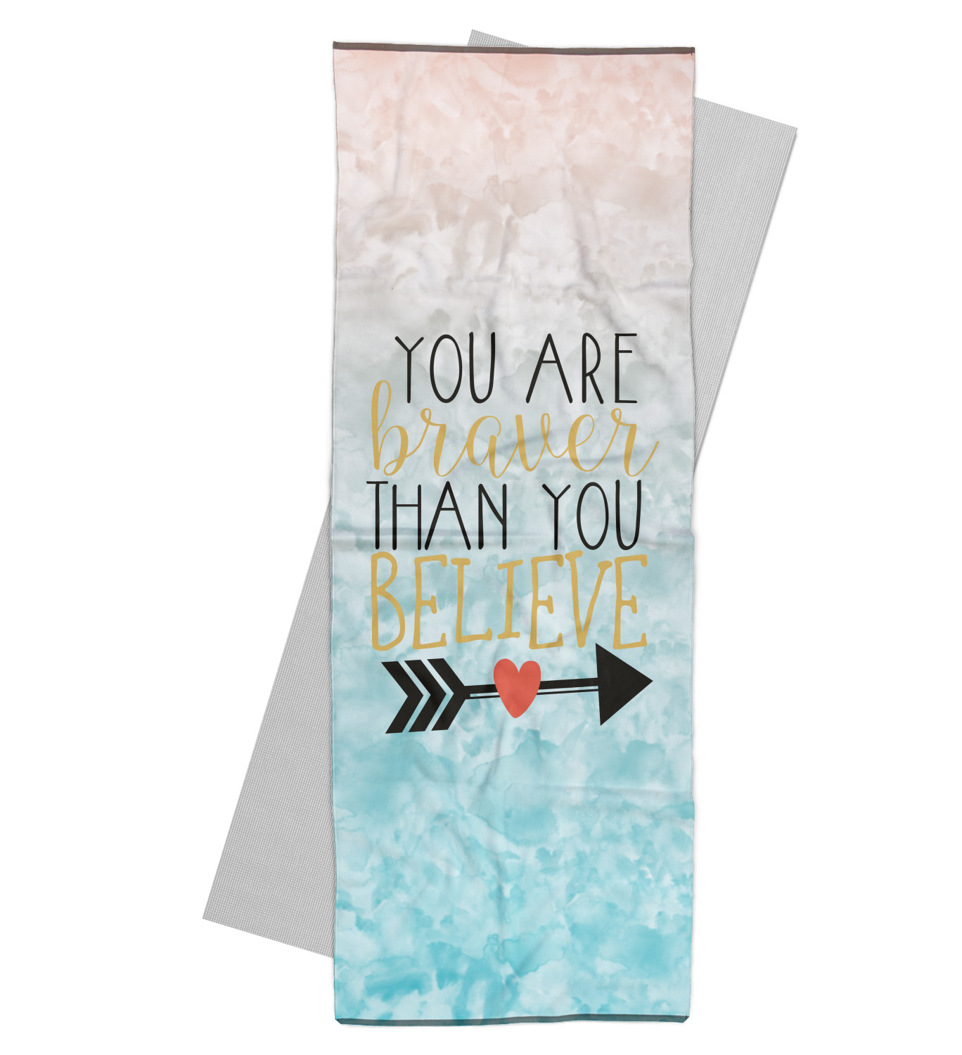 This design features one of our many inspirational quotes. This quote in particular reminds you that "you are braver than you believe." This uplifting quote has beatuiful and playful fonts to create it. An arrow sits below the quote to symbolize the bravery of the heart. The background is a lovely hombre watercolor pattern of teal/turquoise and peach. The calming colors make for a lovely inspirational design.