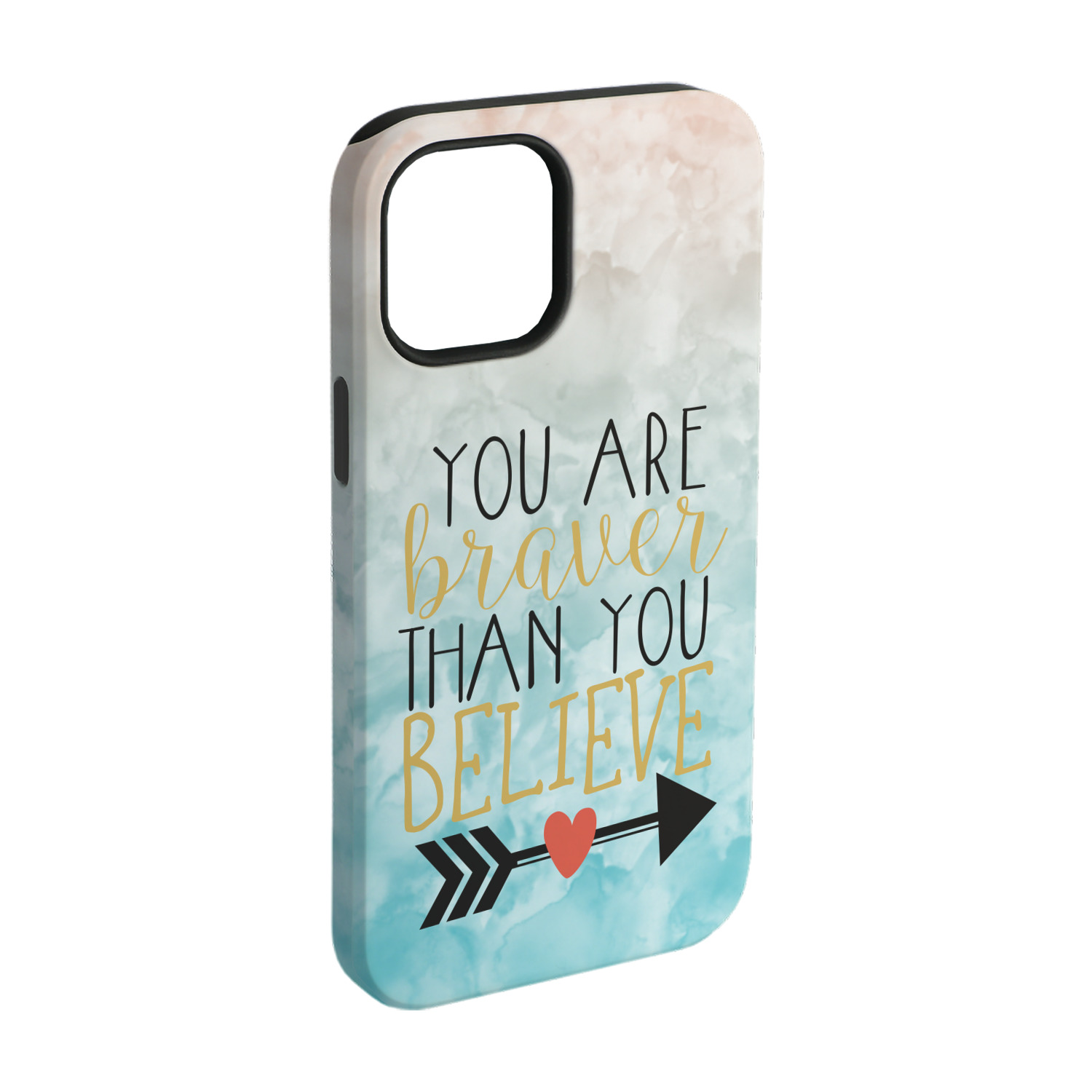 This design features one of our many inspirational quotes. This quote in particular reminds you that "you are braver than you believe." This uplifting quote has beatuiful and playful fonts to create it. An arrow sits below the quote to symbolize the bravery of the heart. The background is a lovely hombre watercolor pattern of teal/turquoise and peach. The calming colors make for a lovely inspirational design.