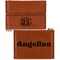Your personalized design is laser engraved onto either the front, or the front and back of the card holder, depending on the model you purchase. Once engraved, the design will appear a darkened black against the cognac color of the leatherette.
