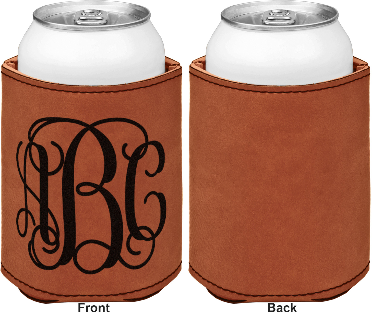 This can sleeve is made from a cognac-brown leatherette and stitched with a sturdy, black thread. A slim padding lines the inside of your can sleeve to allow for a better fit once your drink is inserted. The sleeve itself measures at 4 by 4.5 inches, allowing this custom can sleeve to accommodate most canned drinks. Your personalized design can be engraved on the front and back, or solely the front. When laser-engraved, your design appears as a black coloration which contrasts the leatherette nicely.
