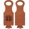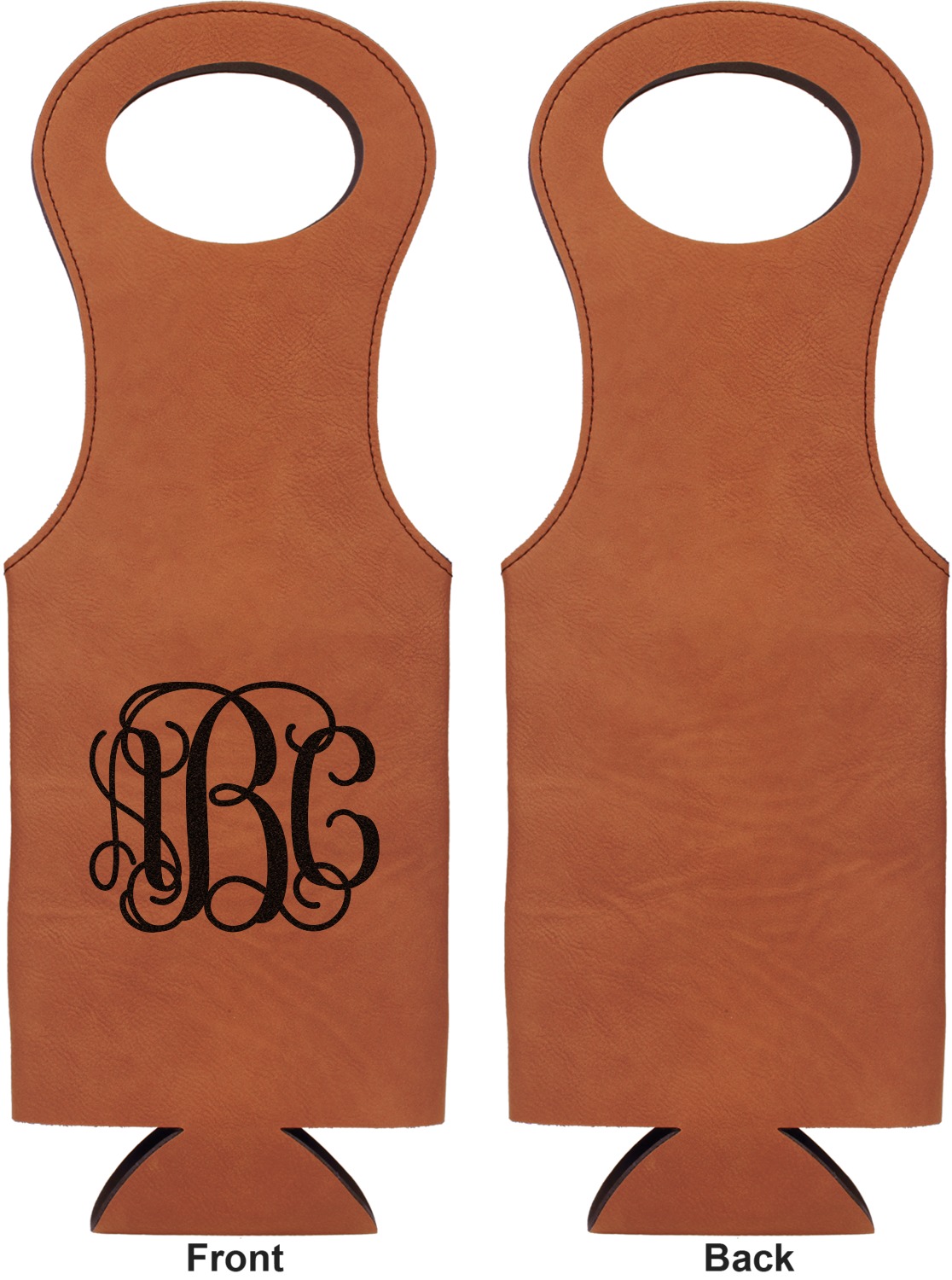 This wine carrier is made from a stunning leatherette, in a cognac-brown color. Strong, black stitching lines the sides of your wine bottle bag and provides extra durability. The interior is lined with a padded, black material to allow for a snug fit once your bottle is placed inside. At the top of this wine gift bag, you'll find two oval shaped handles that elegantly complements the rest of the bag's style. We provide you with the option of laser-engraving the front, or the front and back of your new personalized wine bag!