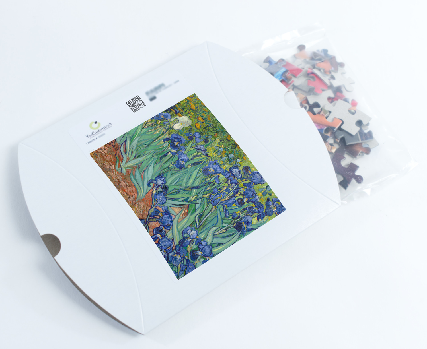 We print our puzzles on thick white chipboard in vibrant colors, then laminate the chipboard and die cut your puzzle. Your jigsaw puzzle is shipped to you in a box with the image of the puzzle on the box.