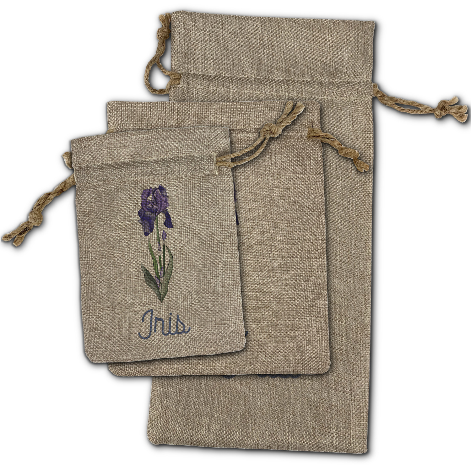 We sell our Burlap Gift Bags in 3 variant sized bags. Made with burlap polyester, each personalized bag can be secured with a twine drawstring pull. Your custom design is available to print on one side or both sides - completely up to you! The sizes of the bags measure approximately 4.5" x 6.5" for the smallest size, 6.5" x 8.0" for the medium size, and 6.5" x 13.5" for the large-sized bag.