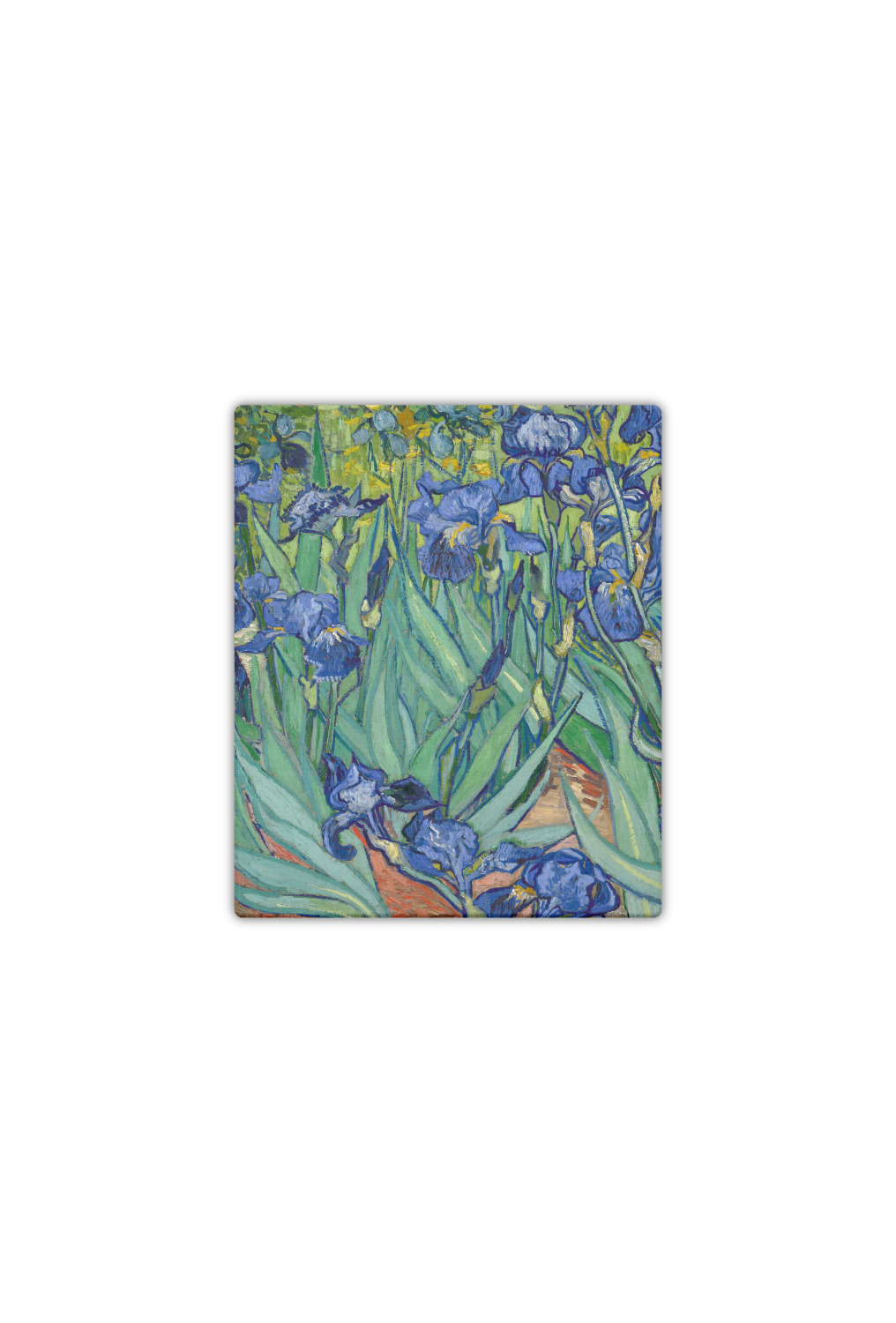 Irises is one of several paintings of irises by the Dutch artist Vincent van Gogh, and one of a series of paintings he executed at the Saint Paul-de-Mausole asylum in Saint-Remy-de-Provence, France, in the last year before his death in 1890. Van Gogh started painting Irises within a week of entering the asylum, in May 1889, working from nature in the hospital garden. There is a lack of the high tension which is seen in his later works. He called painting "the lightning conductor for my illness" because he felt that he could keep himself from going insane by continuing to paint. The painting was probably influenced by Japanese ukiyo-e woodblock prints like many of his works and those by other artists of the time. The similarities occur with strong outlines, unusual angles, including close-up views, and also flattish local colour (not modelled according to the fall of light).(Source: Wikipedia)