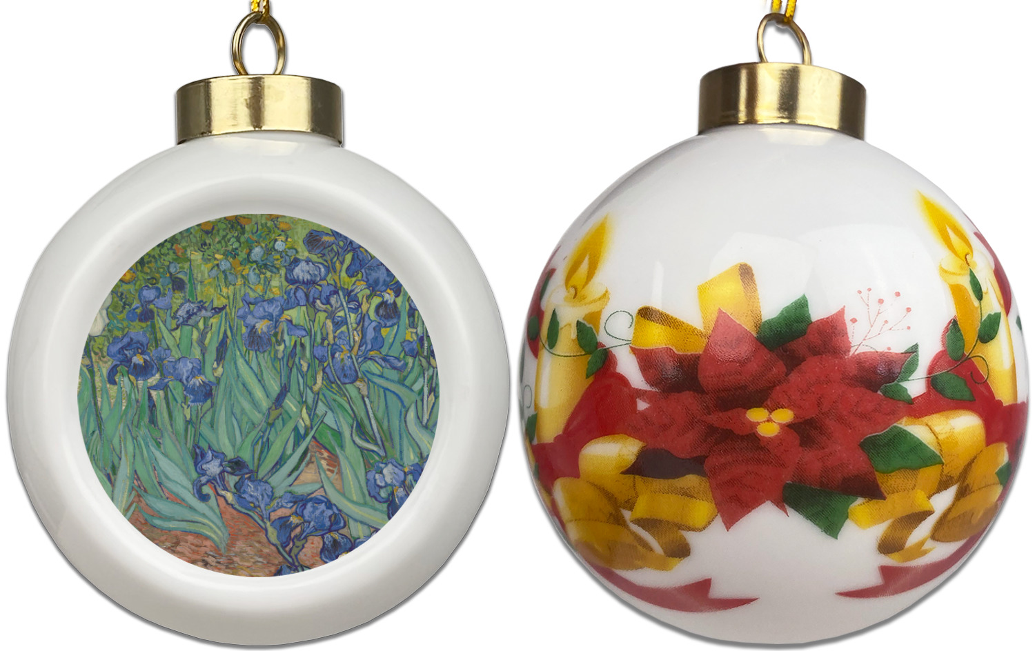 Our Christmas ornaments are a unique ceramic ball shape with a twist as it has a flat face to display your custom design! Select from one of our two design types - Christmas Tree or Poinsettia Garland - to adorn the curved back of your personal design. Each ornament measures 3H x 2.5W x 2D accompanied with a gold string accent for finishing touches to hang on your beautiful Christmas tree!