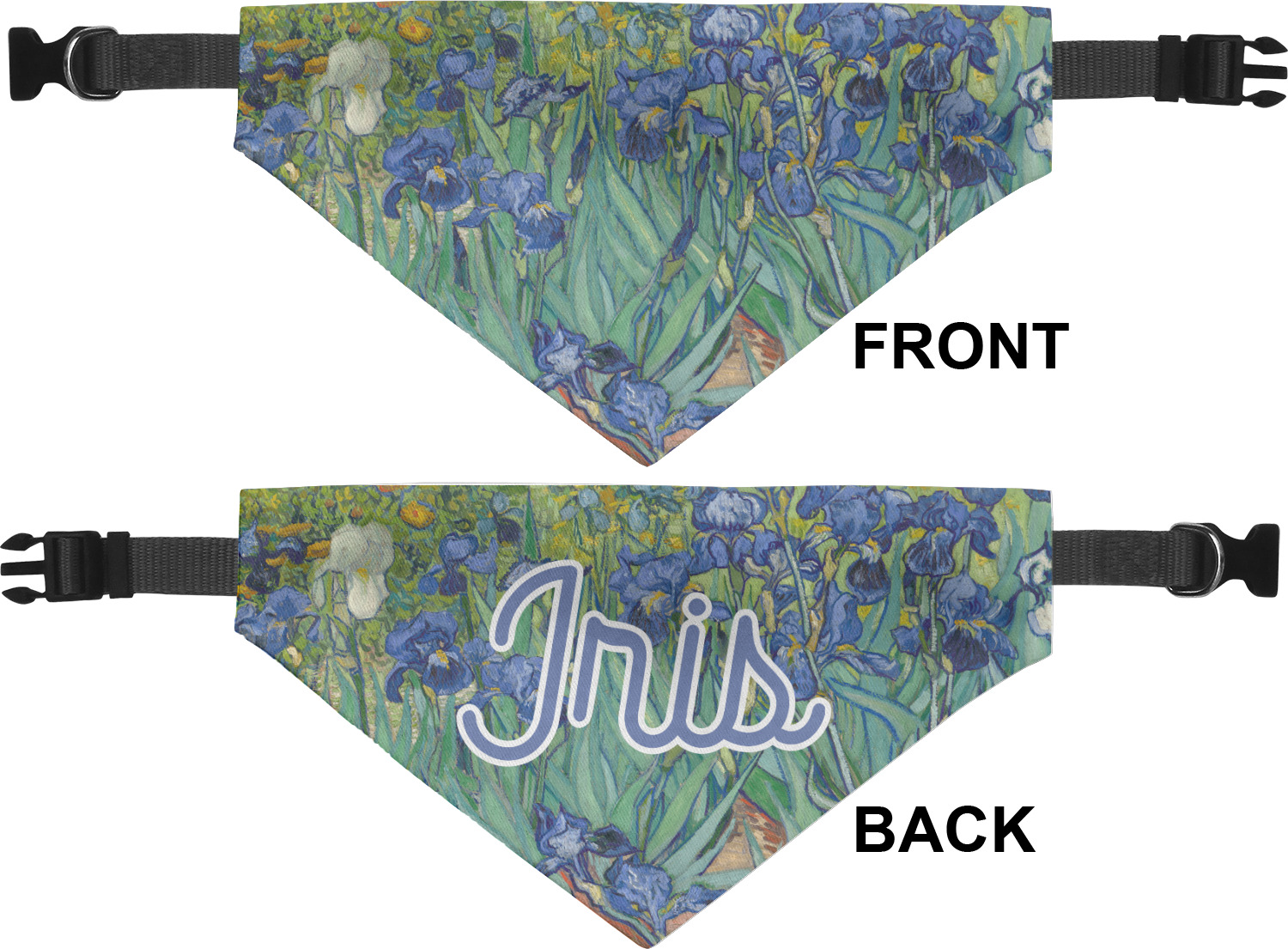 We print the front and back of these dog bandanas with your customized design. The bandana itself is made from a durable polyester, sewn together with a gap large enough to accommodate any collar. Regardless, the bandana includes a plain black, canvas collar with plastic snaps, that can easily be removed if desired. These dog bandana collars are available in four sizes: small, medium, large, and extra large. Please see our sizing chart for more information regarding the dimensions of each size.
