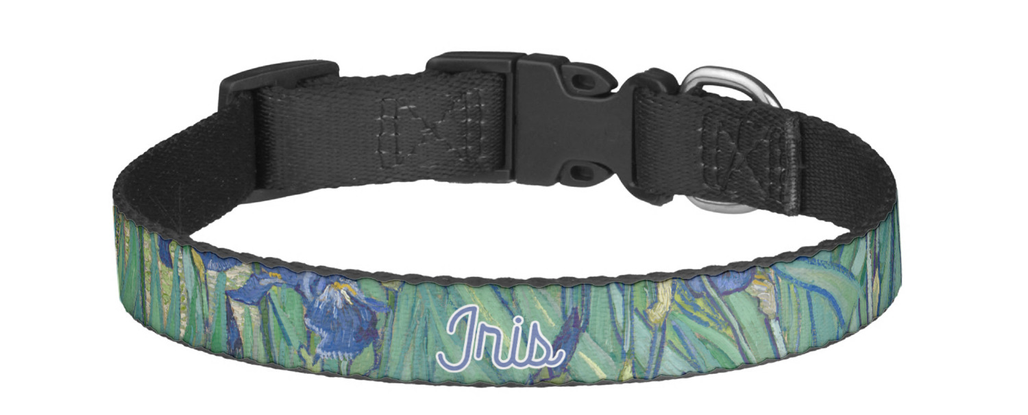 We offer these custom dog collars in two sizes: small and large. Our small dog collar, suitable for Pugs, Corgis, Beagles, and many others, is 10" to 16" long and 0.75" wide. Our large size fits Collies, Labradors, and Standard Poodles and other larger dogs (to name a few), and is 15" to 22" long, and 1" wide.