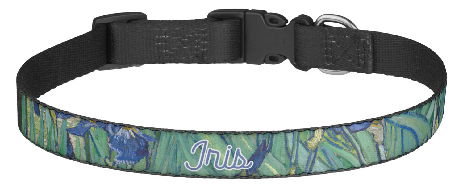 We offer these custom dog collars in two sizes: small and large. Our small dog collar, suitable for Pugs, Corgis, Beagles, and many others, is 10" to 16" long and 0.75" wide. Our large size fits Collies, Labradors, and Standard Poodles and other larger dogs (to name a few), and is 15" to 22" long, and 1" wide.