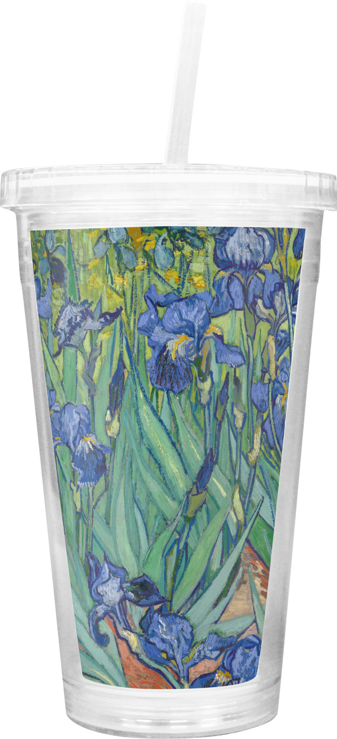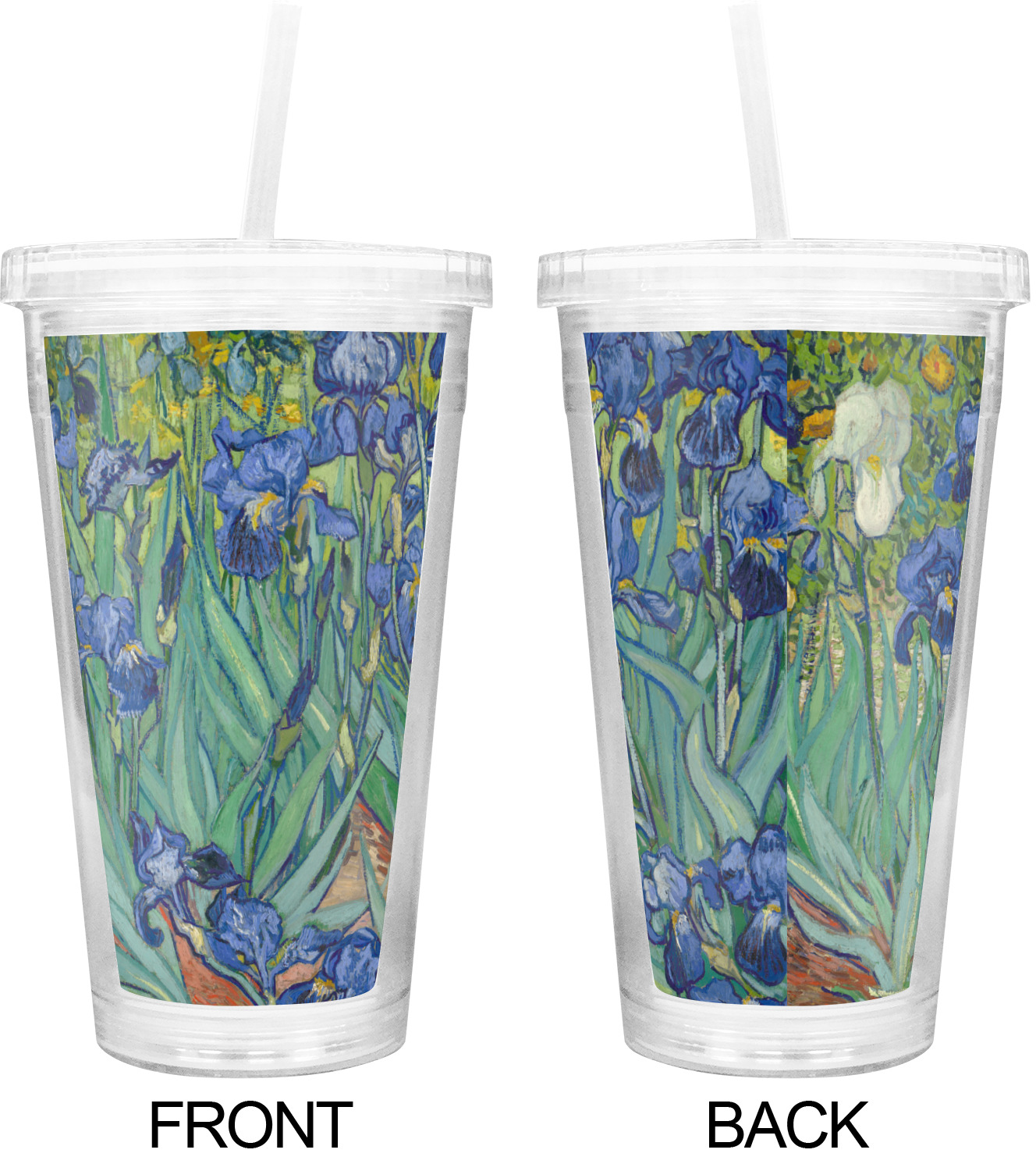 These BPA free tumblers with their double walls keep your drink cold and will not sweat on the outside; they have a clear acrylic top and a reusable straw with a ring around the bottom to keep the straw from falling out.
