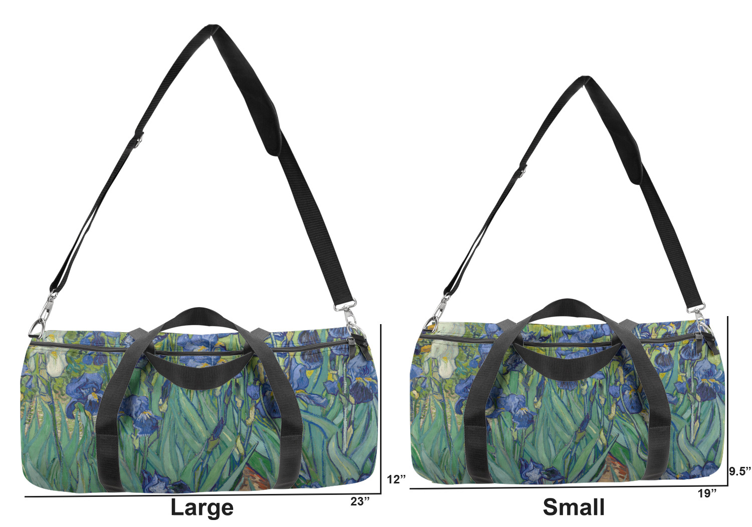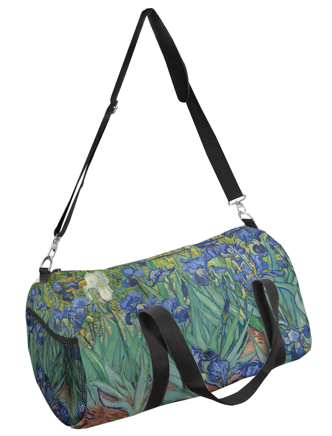 This duffle is a sturdy bag made of a canvas material. It comes in two sizes: Small (19"W x 9.5"H x 9.5"D) and Large (23"W x 12"H x 12"D). The bag is a cylindrical shape with a black adjustable strap and two handles. On one side is an elastic pouch to put a waterbottle or other small item. Your product will be sublimated with your design and is able to be designed on the front, back, and sides. Be sure to remember that the straps may cut into parts of your design if you upload your own artwork.