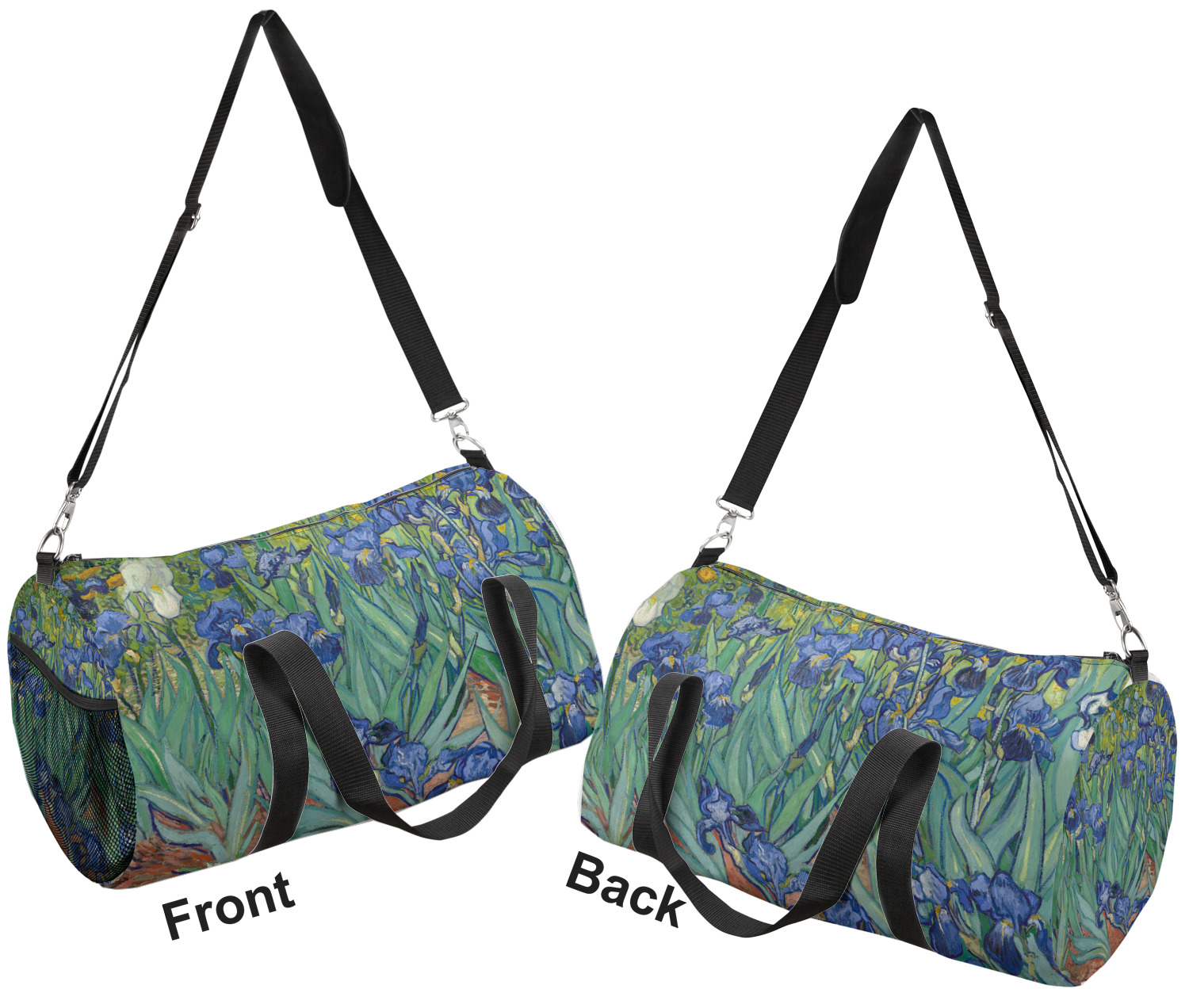 This duffle is a sturdy bag made of a canvas material. It comes in two sizes: Small (19"W x 9.5"H x 9.5"D) and Large (23"W x 12"H x 12"D). The bag is a cylindrical shape with a black adjustable strap and two handles. On one side is an elastic pouch to put a waterbottle or other small item. Your product will be sublimated with your design and is able to be designed on the front, back, and sides. Be sure to remember that the straps may cut into parts of your design if you upload your own artwork.