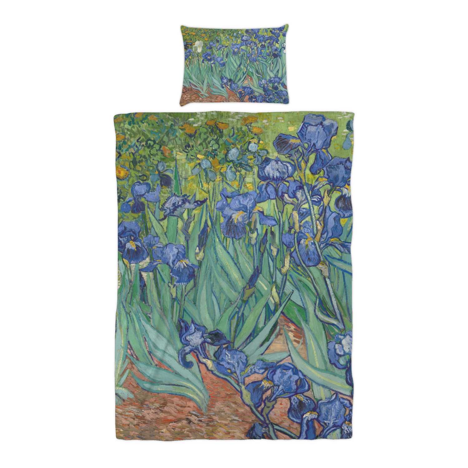 Irises is one of several paintings of irises by the Dutch artist Vincent van Gogh, and one of a series of paintings he executed at the Saint Paul-de-Mausole asylum in Saint-Remy-de-Provence, France, in the last year before his death in 1890. Van Gogh started painting Irises within a week of entering the asylum, in May 1889, working from nature in the hospital garden. There is a lack of the high tension which is seen in his later works. He called painting "the lightning conductor for my illness" because he felt that he could keep himself from going insane by continuing to paint. The painting was probably influenced by Japanese ukiyo-e woodblock prints like many of his works and those by other artists of the time. The similarities occur with strong outlines, unusual angles, including close-up views, and also flattish local colour (not modelled according to the fall of light).(Source: Wikipedia)