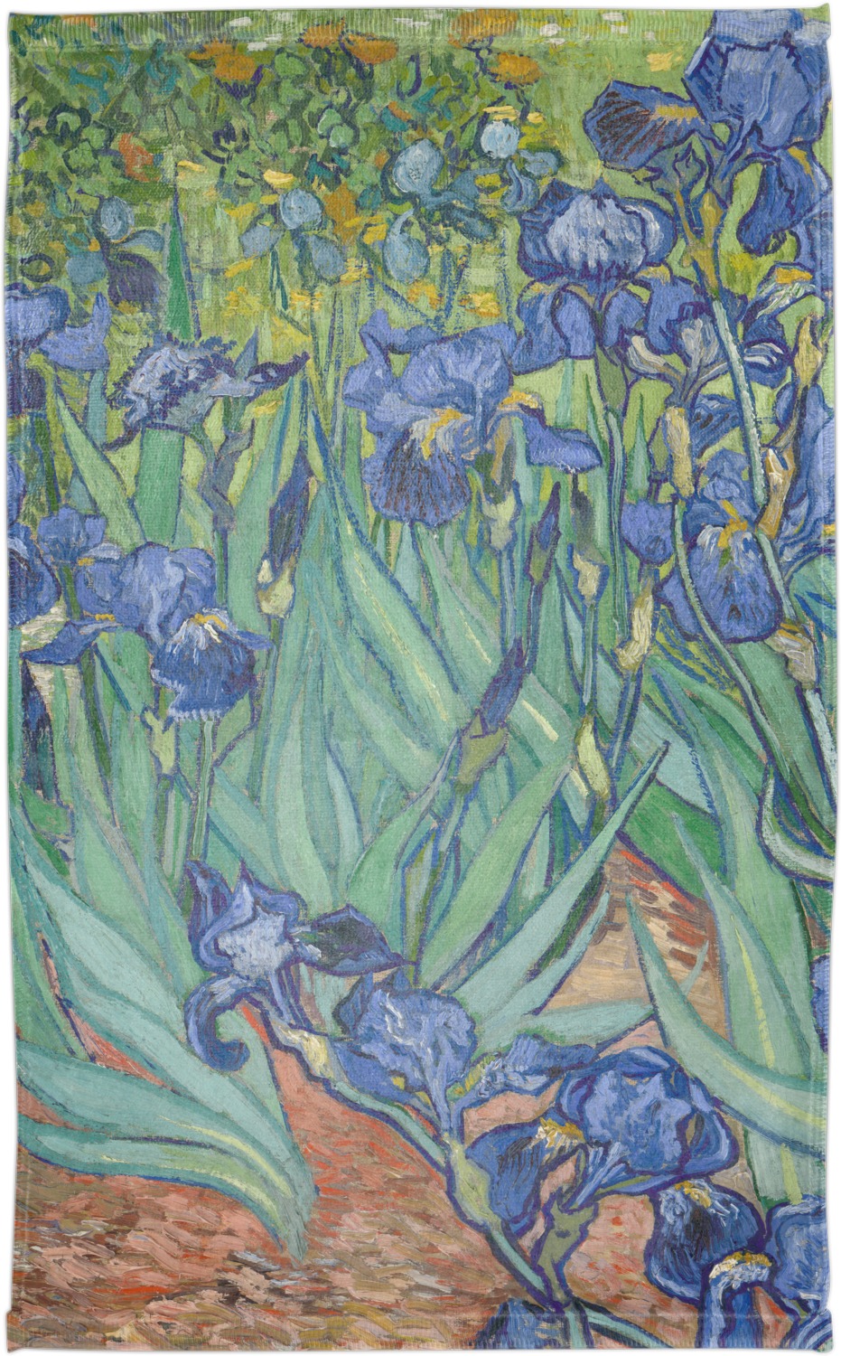 Irises is one of several paintings of irises by the Dutch artist Vincent van Gogh, and one of a series of paintings he executed at the Saint Paul-de-Mausole asylum in Saint-Remy-de-Provence, France, in the last year before his death in 1890. Van Gogh started painting Irises within a week of entering the asylum, in May 1889, working from nature in the hospital garden. There is a lack of the high tension which is seen in his later works. He called painting "the lightning conductor for my illness" because he felt that he could keep himself from going insane by continuing to paint. The painting was probably influenced by Japanese ukiyo-e woodblock prints like many of his works and those by other artists of the time. The similarities occur with strong outlines, unusual angles, including close-up views, and also flattish local colour (not modelled according to the fall of light).(Source: Wikipedia)
