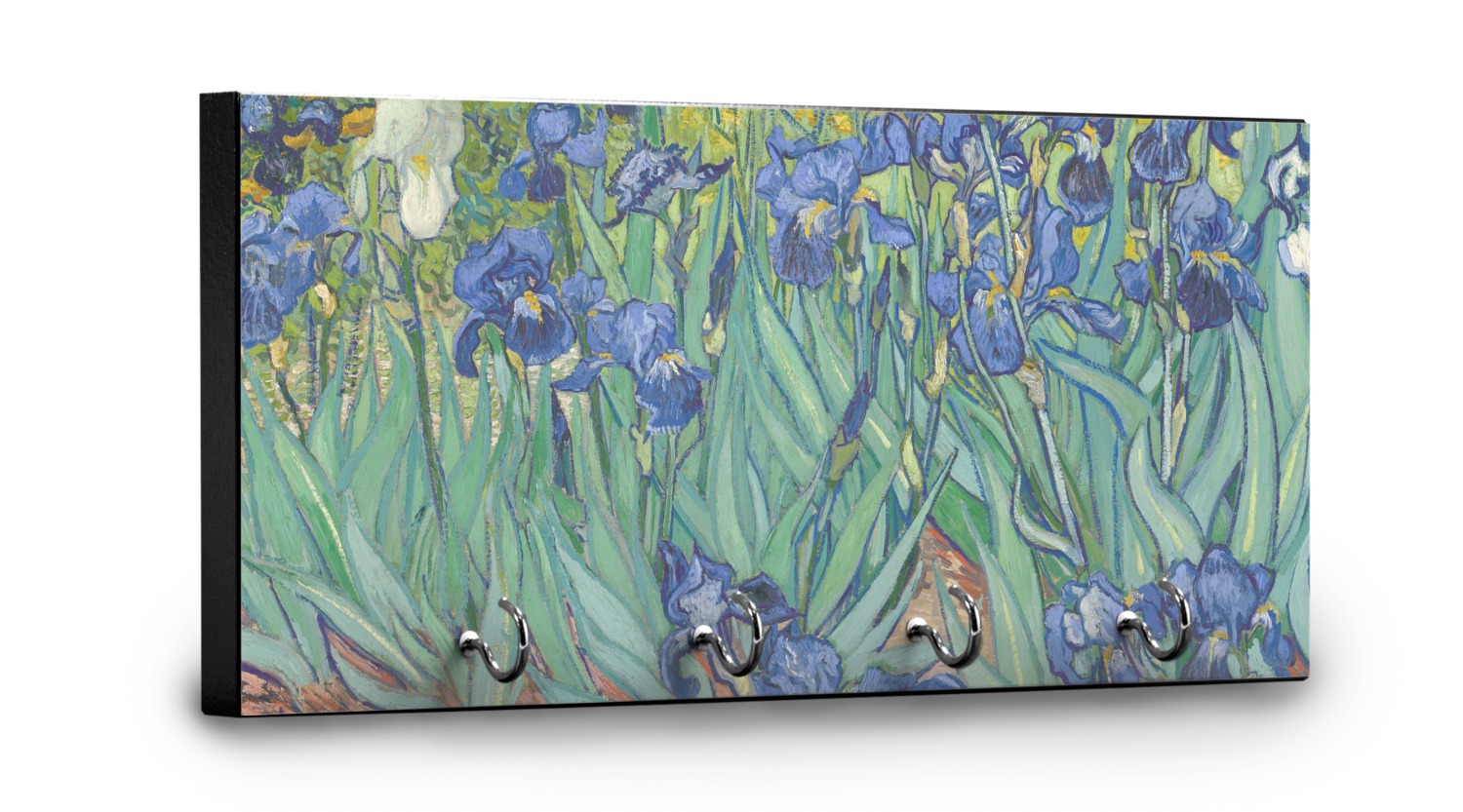 Now you can enjoy Irises on a daily basis. Well not all of it! To put this rectangular painting (roughly 4x3) on products, we use as much of the painting as we can on each product. So for a square product like the shower curtain - we use a 3x3 rectangle - which cuts off a little of the sides - but is still very much Irises For other products such as the wristlet (a wide 4x1 rectangle) - you get a small slice of the painting.
