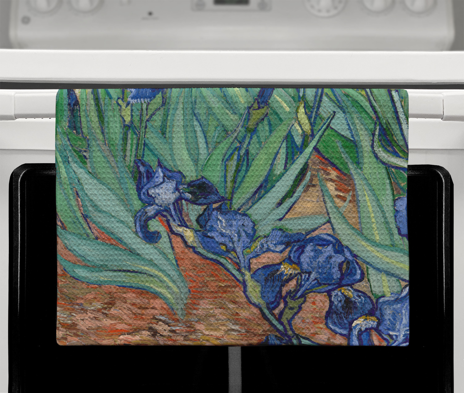 Irises is one of several paintings of irises by the Dutch artist Vincent van Gogh, and one of a series of paintings he executed at the Saint Paul-de-Mausole asylum in Saint-Remy-de-Provence, France, in the last year before his death in 1890. Van Gogh started painting Irises within a week of entering the asylum, in May 1889, working from nature in the hospital garden. There is a lack of the high tension which is seen in his later works. He called painting "the lightning conductor for my illness" because he felt that he could keep himself from going insane by continuing to paint. The painting was probably influenced by Japanese ukiyo-e woodblock prints like many of his works and those by other artists of the time. The similarities occur with strong outlines, unusual angles, including close-up views, and also flattish local colour (not modelled according to the fall of light).(Source: Wikipedia)