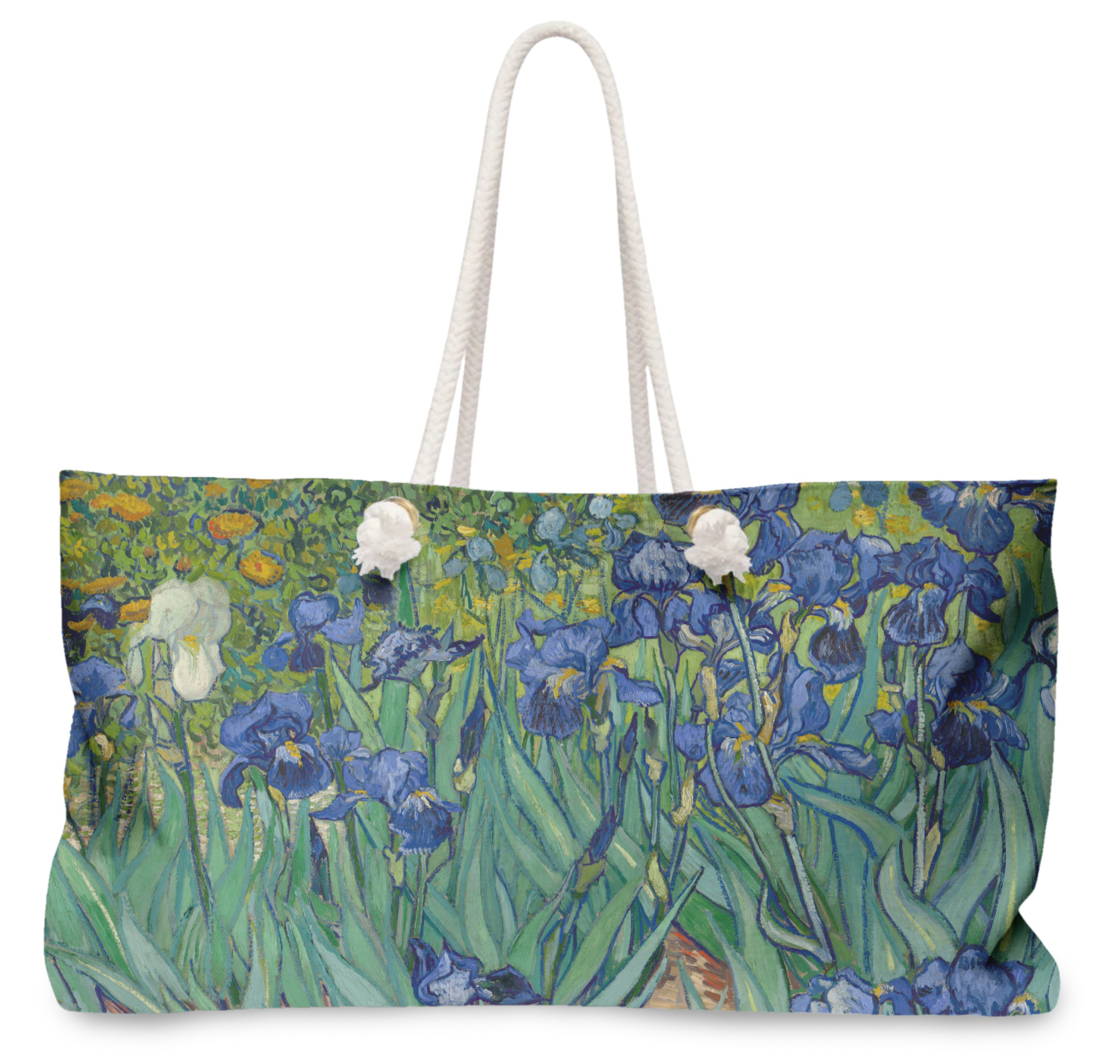 These large totes are handmade i.e. printed, cut and sewn right here in the USA. The canvas like material is printed using dye sublimation; the fabric is then cut and sewn along with a beautiful cream colored lining (to match the rope handles). The brass grommets are then added and the cream colored rope if fed through the grommets and knotted.