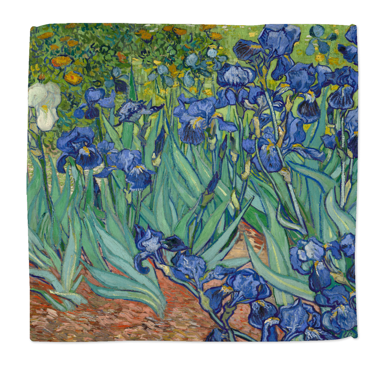 Irises is one of several paintings of irises by the Dutch artist Vincent van Gogh, and one of a series of paintings he executed at the Saint Paul-de-Mausole asylum in Saint-Remy-de-Provence, France, in the last year before his death in 1890. Van Gogh started painting Irises within a week of entering the asylum, in May 1889, working from nature in the hospital garden. There is a lack of the high tension which is seen in his later works. He called painting "the lightning conductor for my illness" because he felt that he could keep himself from going insane by continuing to paint. The painting was probably influenced by Japanese ukiyo-e woodblock prints like many of his works and those by other artists of the time. The similarities occur with strong outlines, unusual angles, including close-up views, and also flattish local colour (not modelled according to the fall of light).(Source: Wikipedia)