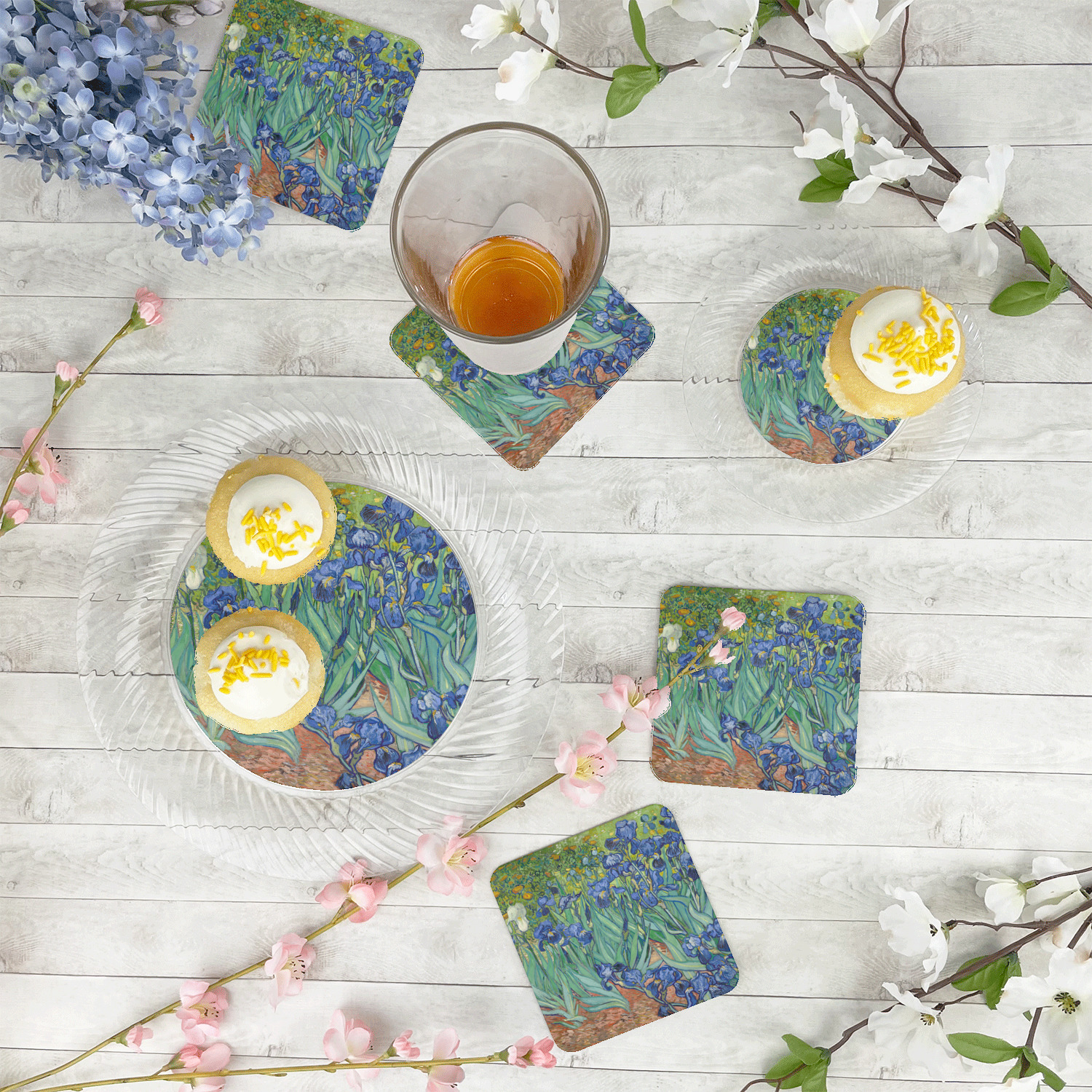 Irises is one of several paintings of irises by the Dutch artist Vincent van Gogh, and one of a series of paintings he executed at the Saint Paul-de-Mausole asylum in Saint-Remy-de-Provence, France, in the last year before his death in 1890. Van Gogh started painting Irises within a week of entering the asylum, in May 1889, working from nature in the hospital garden. There is a lack of the high tension which is seen in his later works. He called painting "the lightning conductor for my illness" because he felt that he could keep himself from going insane by continuing to paint. The painting was probably influenced by Japanese ukiyo-e woodblock prints like many of his works and those by other artists of the time. The similarities occur with strong outlines, unusual angles, including close-up views, and also flattish local colour (not modelled according to the fall of light).(Source: Wikipedia)