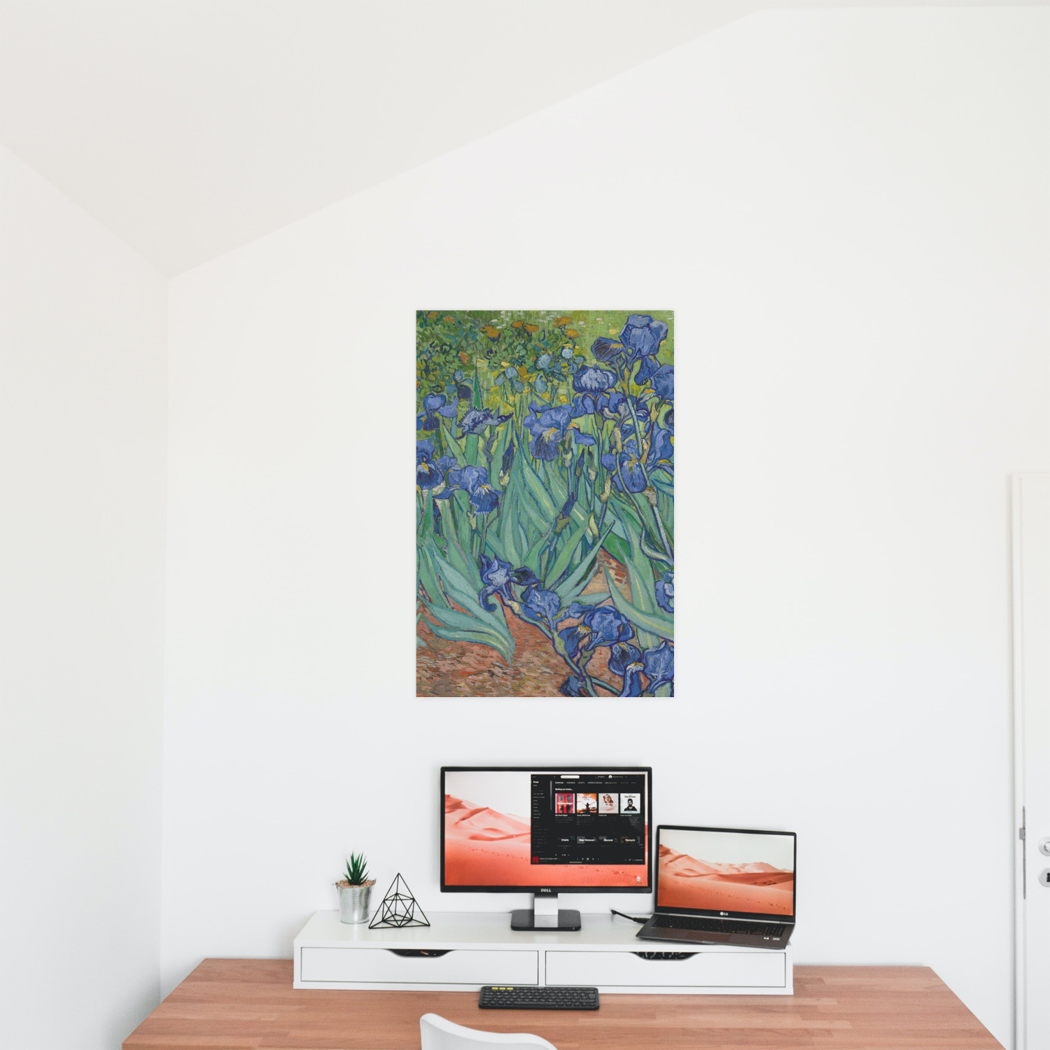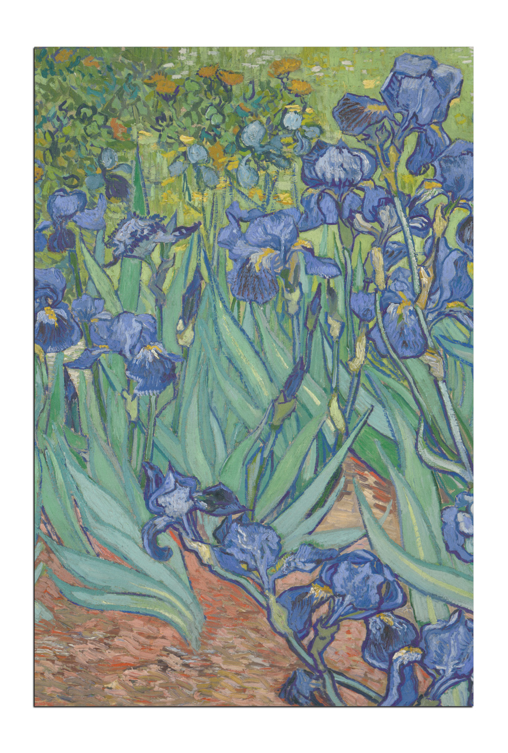 Irises is one of several paintings of irises by the Dutch artist Vincent van Gogh, and one of a series of paintings he executed at the Saint Paul-de-Mausole asylum in Saint-Remy-de-Provence, France, in the last year before his death in 1890. Van Gogh started painting Irises within a week of entering the asylum, in May 1889, working from nature in the hospital garden. There is a lack of the high tension which is seen in his later works. He called painting "the lightning conductor for my illness" because he felt that he could keep himself from going insane by continuing to paint. The painting was probably influenced by Japanese ukiyo-e woodblock prints like many of his works and those by other artists of the time. The similarities occur with strong outlines, unusual angles, including close-up views, and also flattish local colour (not modelled according to the fall of light).(Source: Wikipedia)