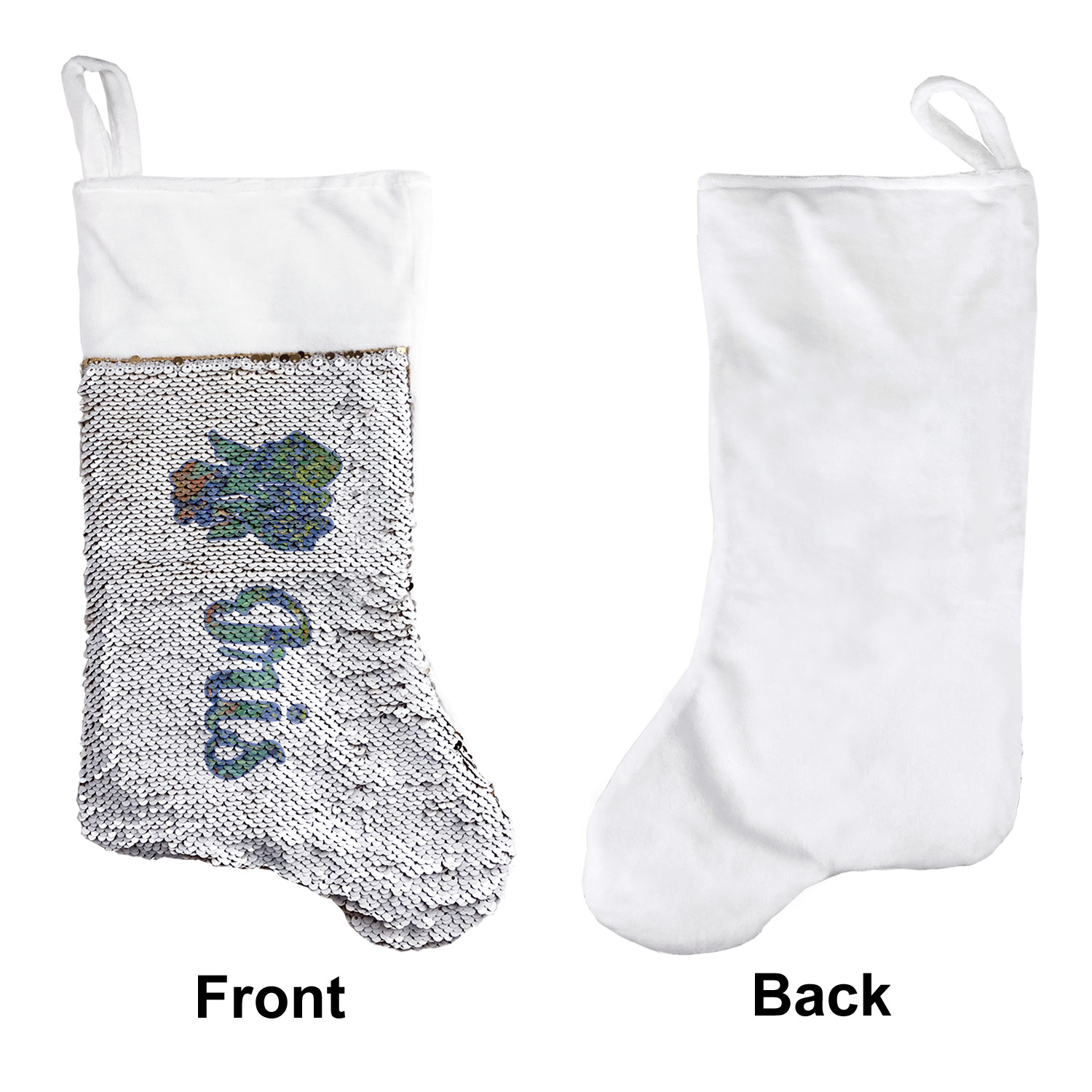 Our fun sequin stockings are made from a soft, yet durable polyester material perfect for any stocking stuffer or holiday decor! Choose from a glamorous gold stocking or classic red sequin stocking for the front color and have your personalized image printed behind for reversible fun! Our sparkly sequin stockings are super fun and decorative perfect for the family and you this holiday! Each stocking is approximately 17" x 9" with a durable loop for hanging and printed here in the US.