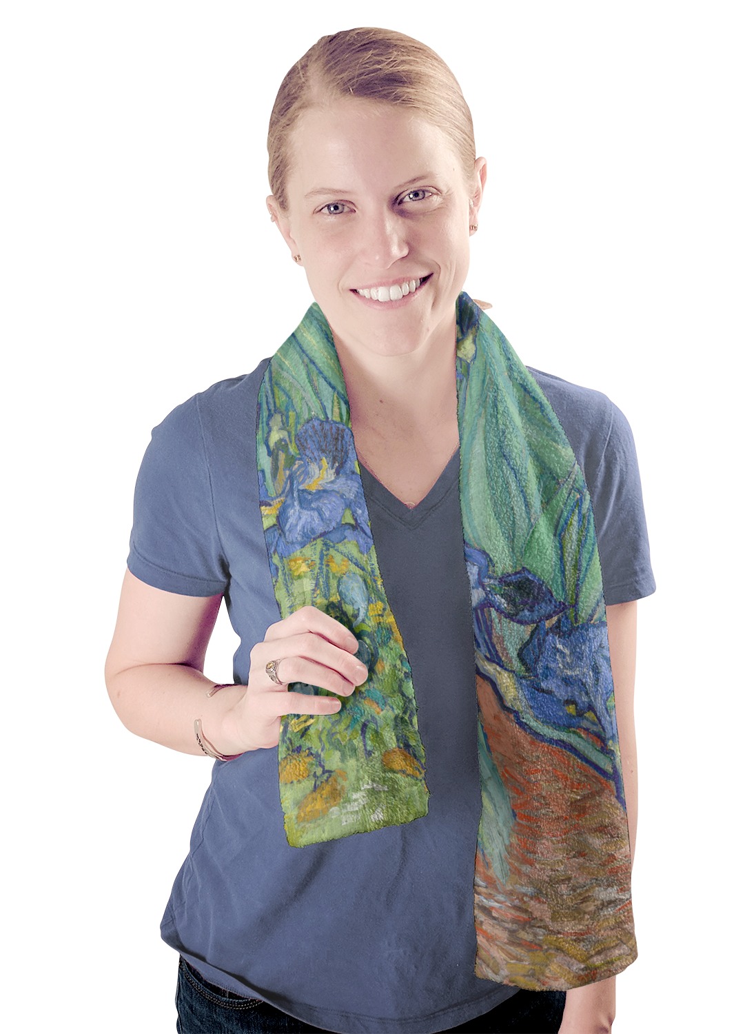 Now you can enjoy Irises on a daily basis. Well not all of it! To put this rectangular painting (roughly 4x3) on products, we use as much of the painting as we can on each product. So for a square product like the shower curtain - we use a 3x3 rectangle - which cuts off a little of the sides - but is still very much Irises For other products such as the wristlet (a wide 4x1 rectangle) - you get a small slice of the painting.