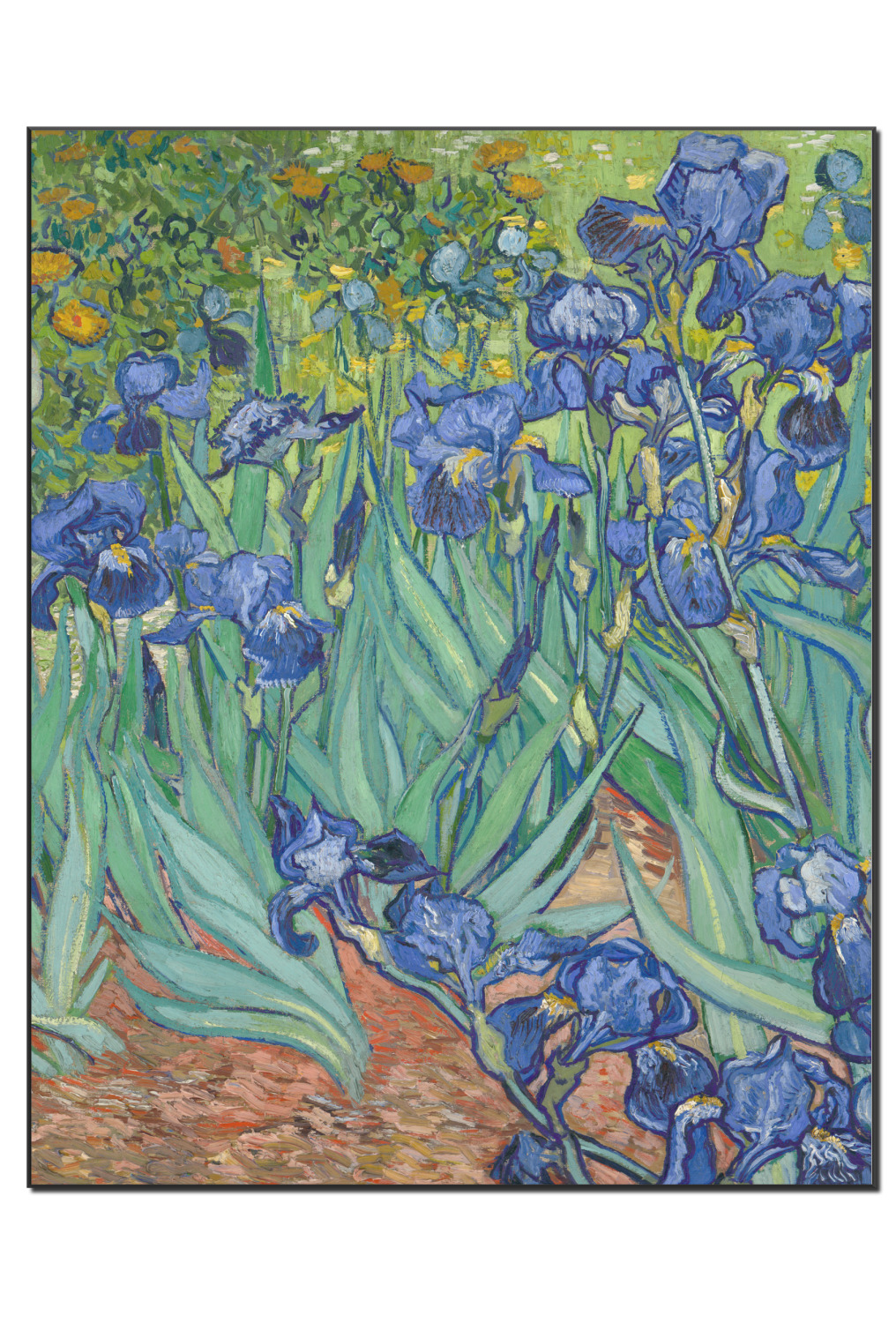 Irises is one of several paintings of irises by the Dutch artist Vincent van Gogh, and one of a series of paintings he executed at the Saint Paul-de-Mausole asylum in Saint-Remy-de-Provence, France, in the last year before his death in 1890. Van Gogh started painting Irises within a week of entering the asylum, in May 1889, working from nature in the hospital garden. There is a lack of the high tension which is seen in his later works. He called painting "the lightning conductor for my illness" because he felt that he could keep himself from going insane by continuing to paint. The painting was probably influenced by Japanese ukiyo-e woodblock prints like many of his works and those by other artists of the time. The similarities occur with strong outlines, unusual angles, including close-up views, and also flattish local colour (not modelled according to the fall of light).(Source: Wikipedia)