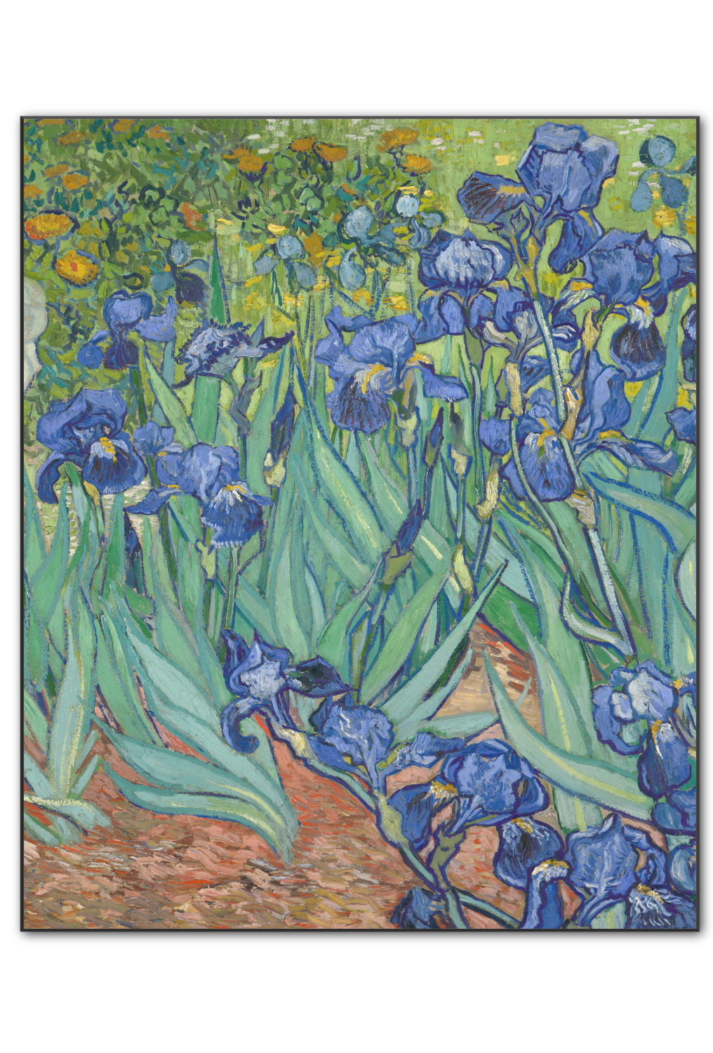 Irises is one of several paintings of irises by the Dutch artist Vincent van Gogh, and one of a series of paintings he executed at the Saint Paul-de-Mausole asylum in Saint-Remy-de-Provence, France, in the last year before his death in 1890. Van Gogh started painting Irises within a week of entering the asylum, in May 1889, working from nature in the hospital garden. There is a lack of the high tension which is seen in his later works. He called painting "the lightning conductor for my illness" because he felt that he could keep himself from going insane by continuing to paint. The painting was probably influenced by Japanese ukiyo-e woodblock prints like many of his works and those by other artists of the time. The similarities occur with strong outlines, unusual angles, including close-up views, and also flattish local colour (not modelled according to the fall of light).(Source: Wikipedia)