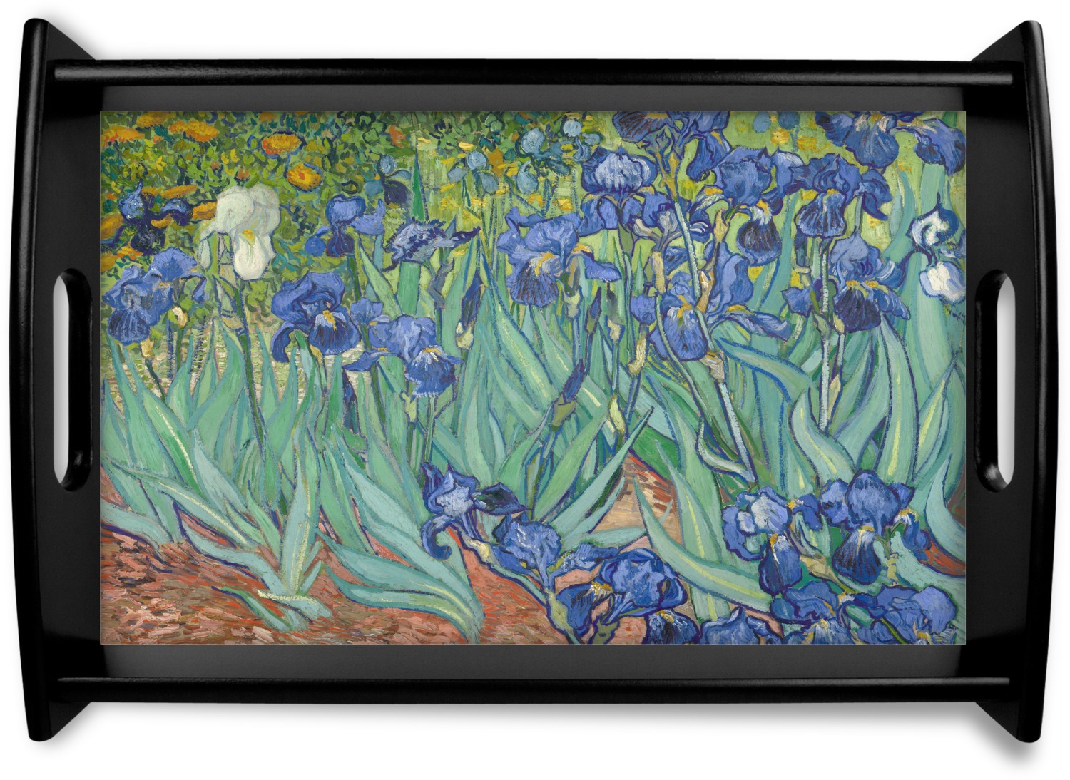 Irises is one of several paintings of irises by the Dutch artist Vincent van Gogh, and one of a series of paintings he executed at the Saint Paul-de-Mausole asylum in Saint-Remy-de-Provence, France, in the last year before his death in 1890. Van Gogh started painting Irises within a week of entering the asylum, in May 1889, working from nature in the hospital garden. There is a lack of the high tension which is seen in his later works. He called painting "the lightning conductor for my illness" because he felt that he could keep himself from going insane by continuing to paint. The painting was probably influenced by Japanese ukiyo-e woodblock prints like many of his works and those by other artists of the time. The similarities occur with strong outlines, unusual angles, including close-up views, and also flattish local colour (not modelled according to the fall of light).(Source: Wikipedia)