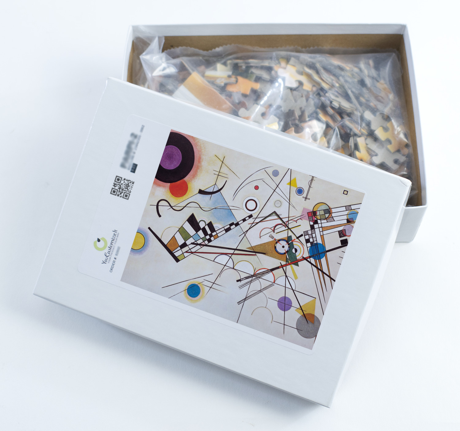 We print our puzzles on thick white chipboard in vibrant colors, then laminate the chipboard and die cut your puzzle. Your jigsaw puzzle is shipped to you in a box with the image of the puzzle on the box.