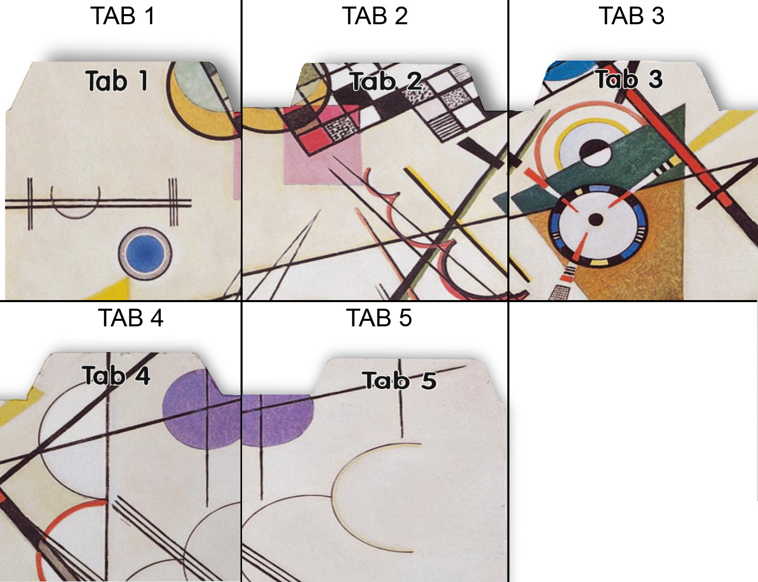 Whether you use binders at school or at work, we have designs to suit all of them. Available in 5 or 6 tab sets, you are sure to find a set to suit your needs. The back of each one is white and can be used to take notes, write vital information on, etc.