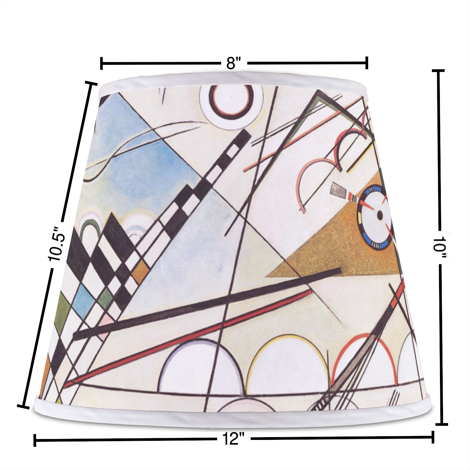 The base of this lampshade is 12 inches in diameter, and the top spans 8 inches in diameter. The total height of the lampshade is 10 inches. The angled nature of this custom lampshade concentrates the light, making it ideal for smaller spaces. This lampshade is made of matte, polyfilm, and displays your customization in its middle. The top and bottom of this colorful lamp shade are lined with a white fabric ribbon (which can be replaced with black inside the design studio) which frames your design and creates a sophisticated finish. As an UNO fitter lampshade, this unique lamp shade will fit a variety of bases.