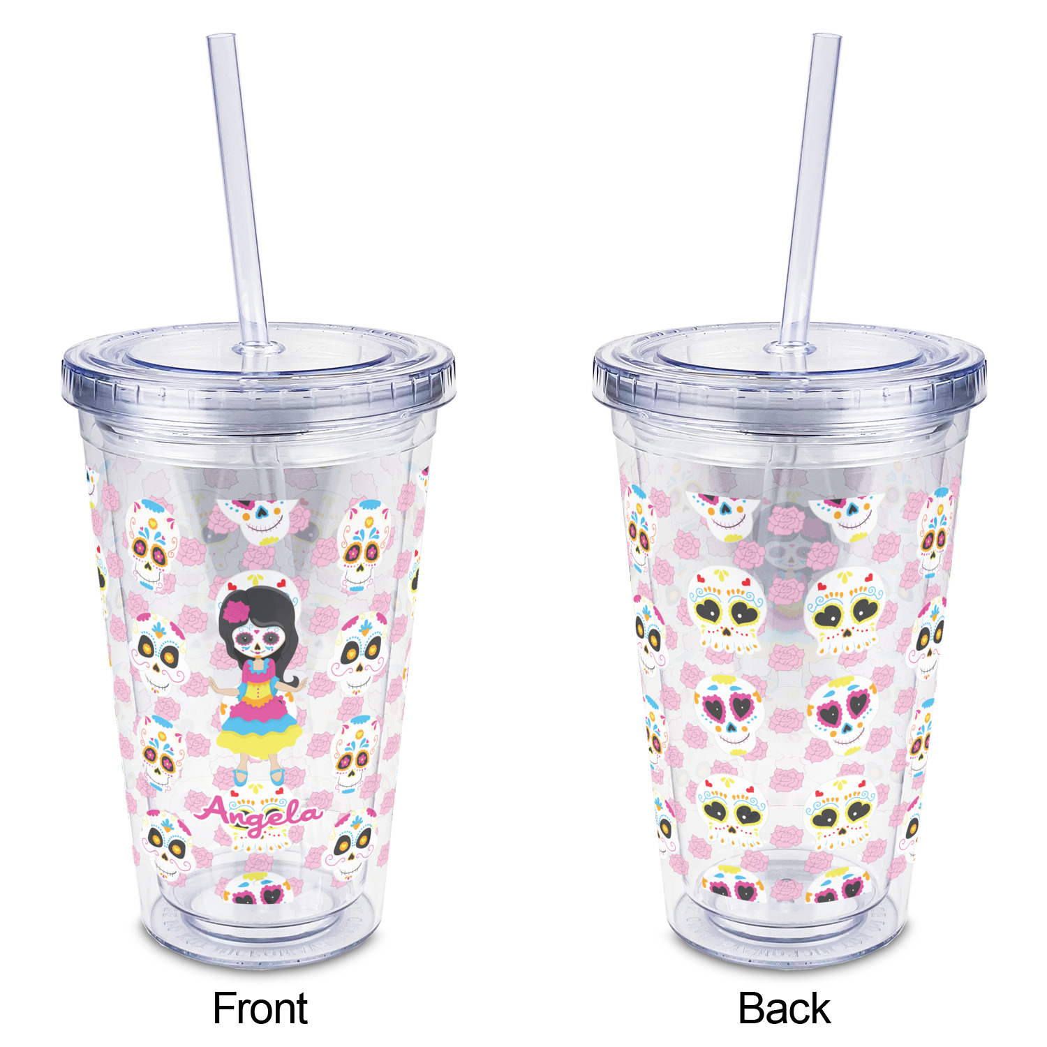 Most sugar skull design are only suitable for adults - not this one! This sugar skulls designs was done especially for kids who love sugar skulls. This is another one of our many layered designs where the background is a coordinating floral pattern; with kid friendly sugar skulls on top. We then topped it off with our girl who has her face painted. For personalization, we added her name to the bottom.