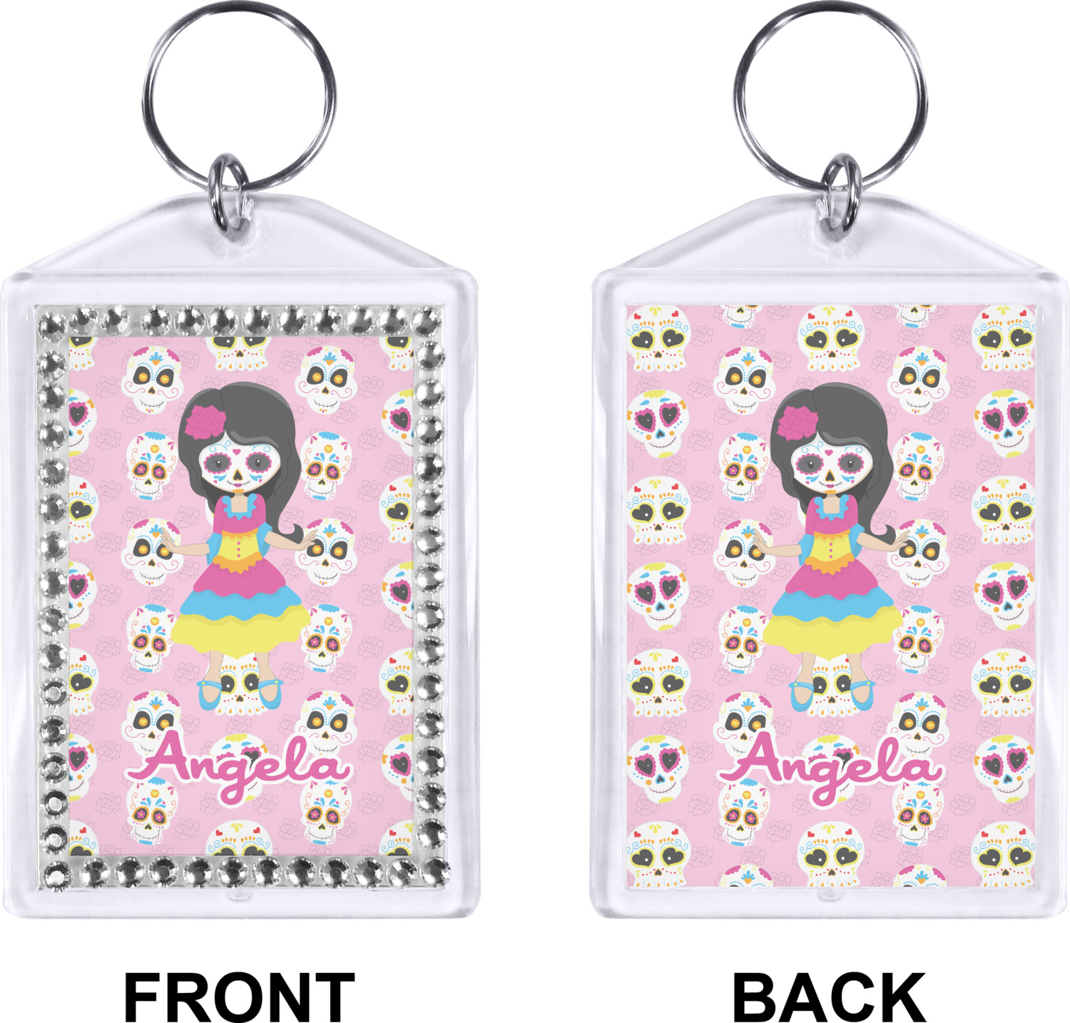 Our personalized keychains have a bold, rectangular shape, outlined by a series of shimmering rhinestones. A metal, split keyring is included with your purchase, and an additional metal hoop allows for attachment of the keychain to the split ring. This unique keychain measures at about 3.75 by 2.5 inches. We print your customized design(s) across both the back and front of this keychain.