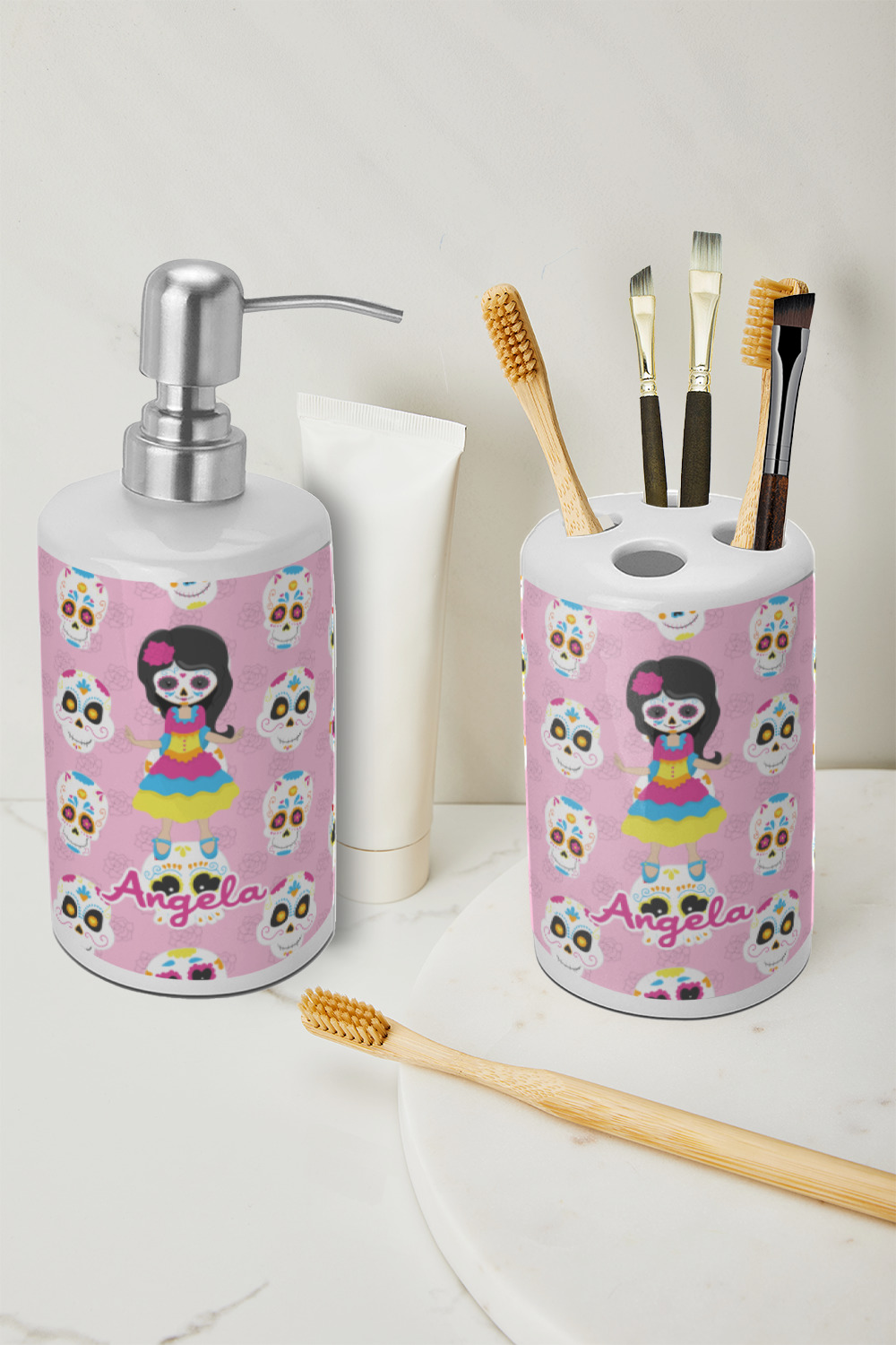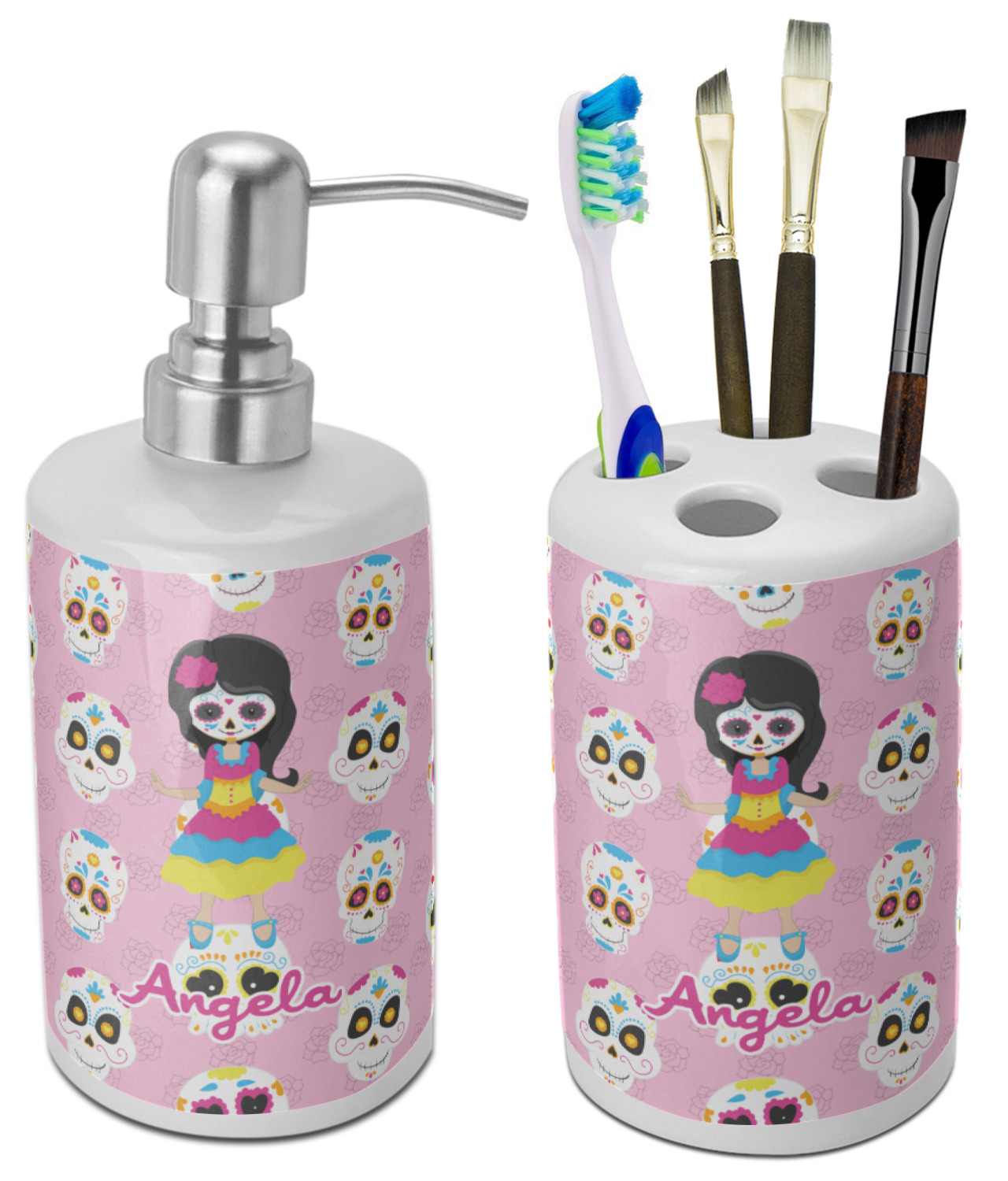 This two piece, ceramic bathroom set will add the perfect splash of color to any bathroom. This set includes one pump dispenser, ideal for soap or lotion, and one toothbrush holder with four holes. Although originally designed for toothbrushes, the holder will also hold make-up brushes, nail files, and other bathroom tools.
