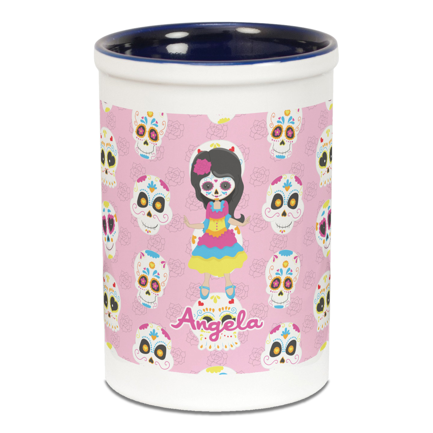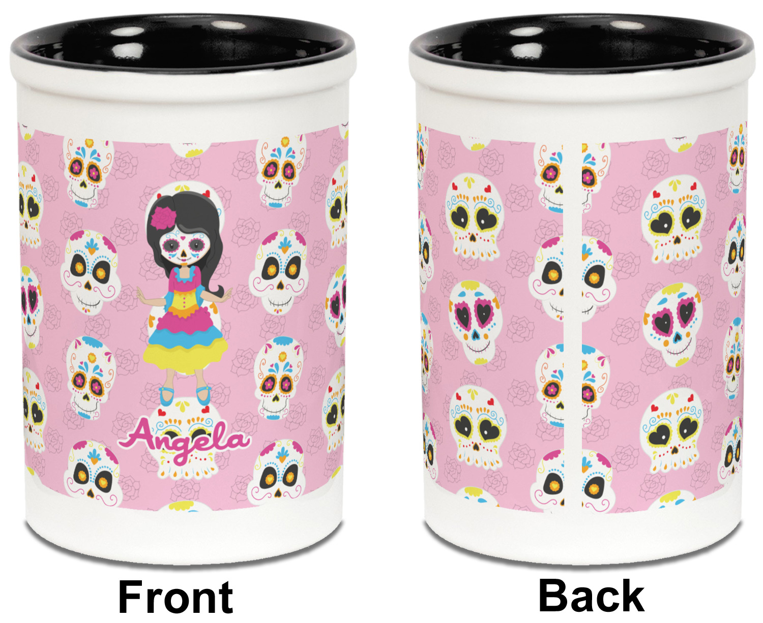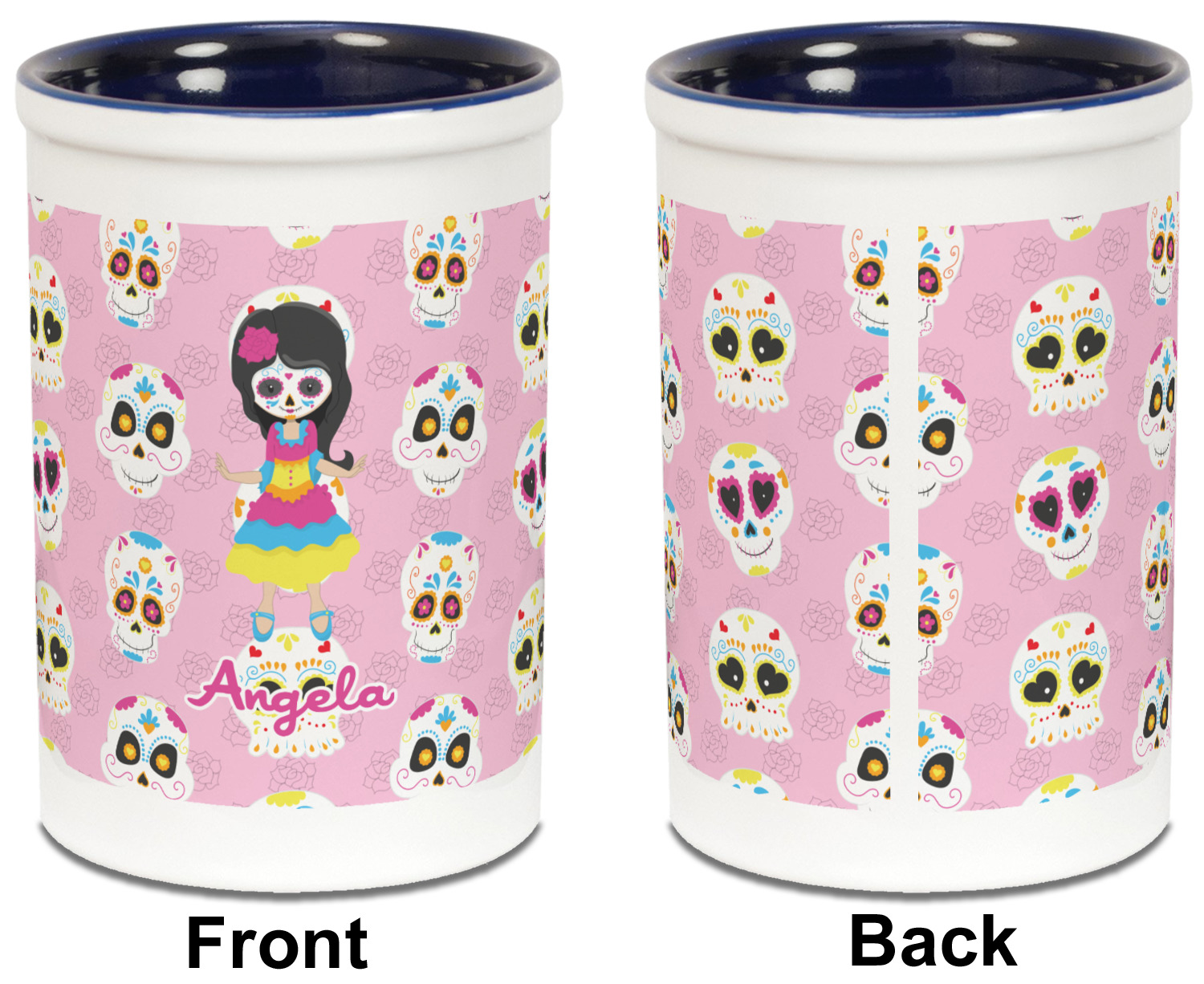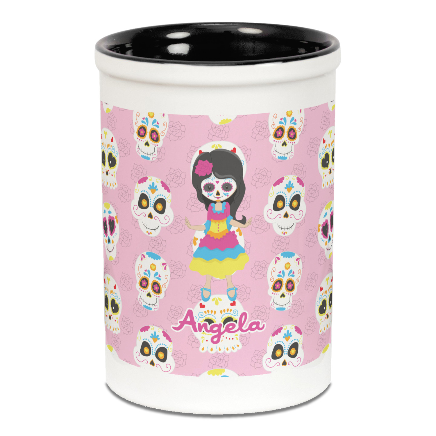 Most sugar skull design are only suitable for adults - not this one! This sugar skulls designs was done especially for kids who love sugar skulls. This is another one of our many layered designs where the background is a coordinating floral pattern; with kid friendly sugar skulls on top. We then topped it off with our girl who has her face painted. For personalization, we added her name to the bottom.