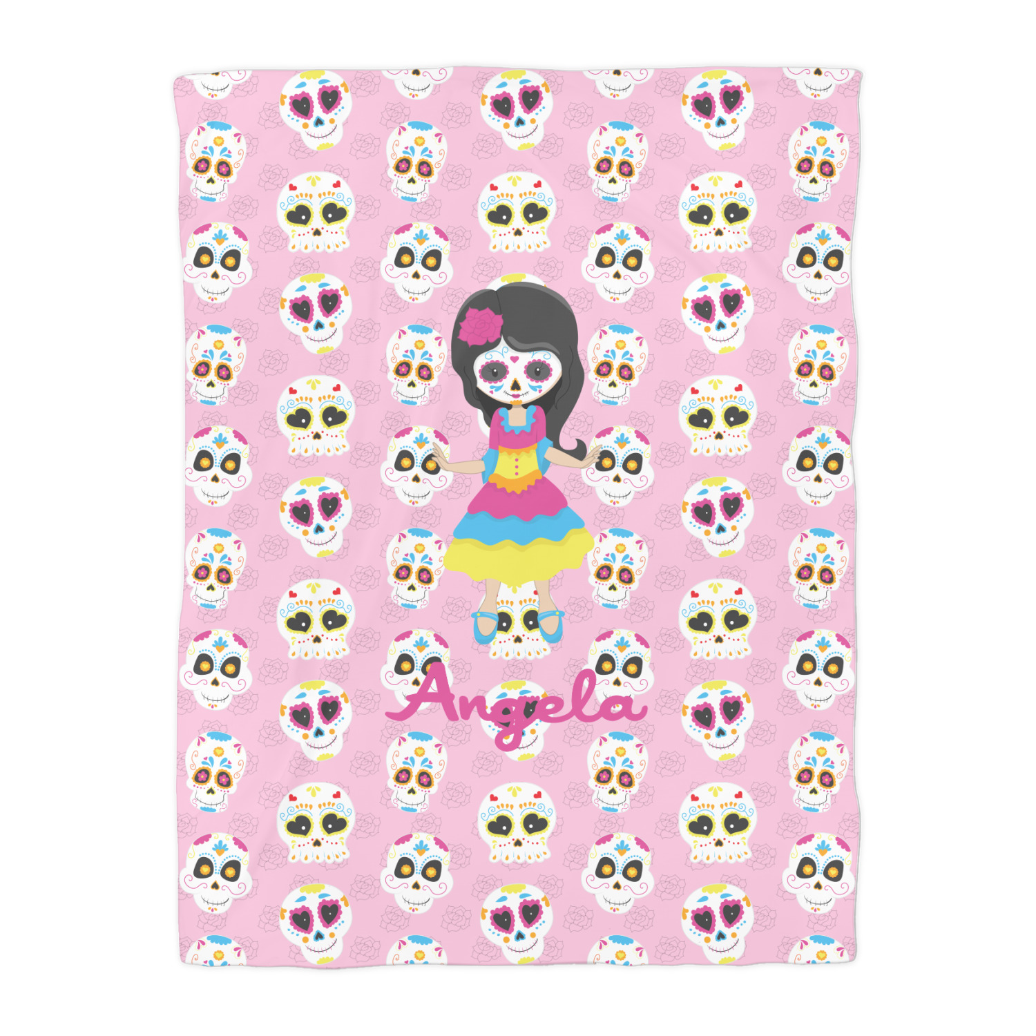 Most sugar skull design are only suitable for adults - not this one! This sugar skulls designs was done especially for kids who love sugar skulls. This is another one of our many layered designs where the background is a coordinating floral pattern; with kid friendly sugar skulls on top. We then topped it off with our girl who has her face painted. For personalization, we added her name to the bottom.