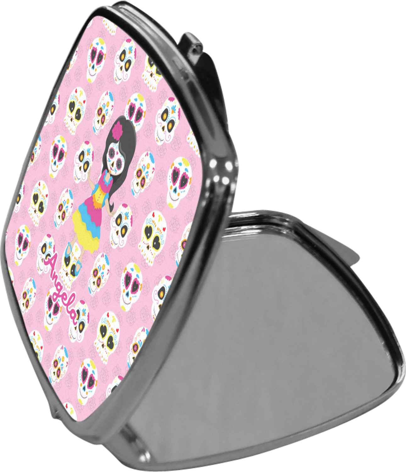 Our compact mirrors are customized with your design on one side. The other side is patterned silver tone metal. Inside, there are two mirrors.