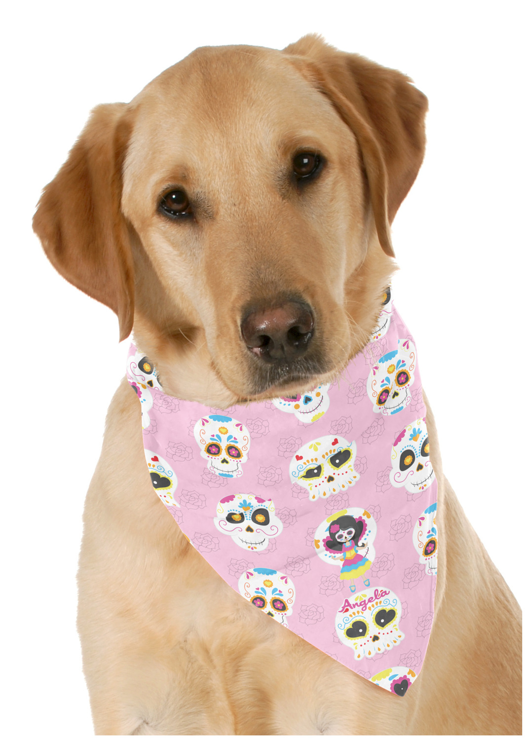 This beautiful pet bandana really is the perfect accessory. It is made from a silky feeling polyester and measures at approximately 23" x 23". Your personalization will be printed on a diagonal, so that you are able to read the personalization when folded into a triangle. This bandana fits best on large dogs, but can be folded smaller if there is no personalized text to fit smaller pets.
